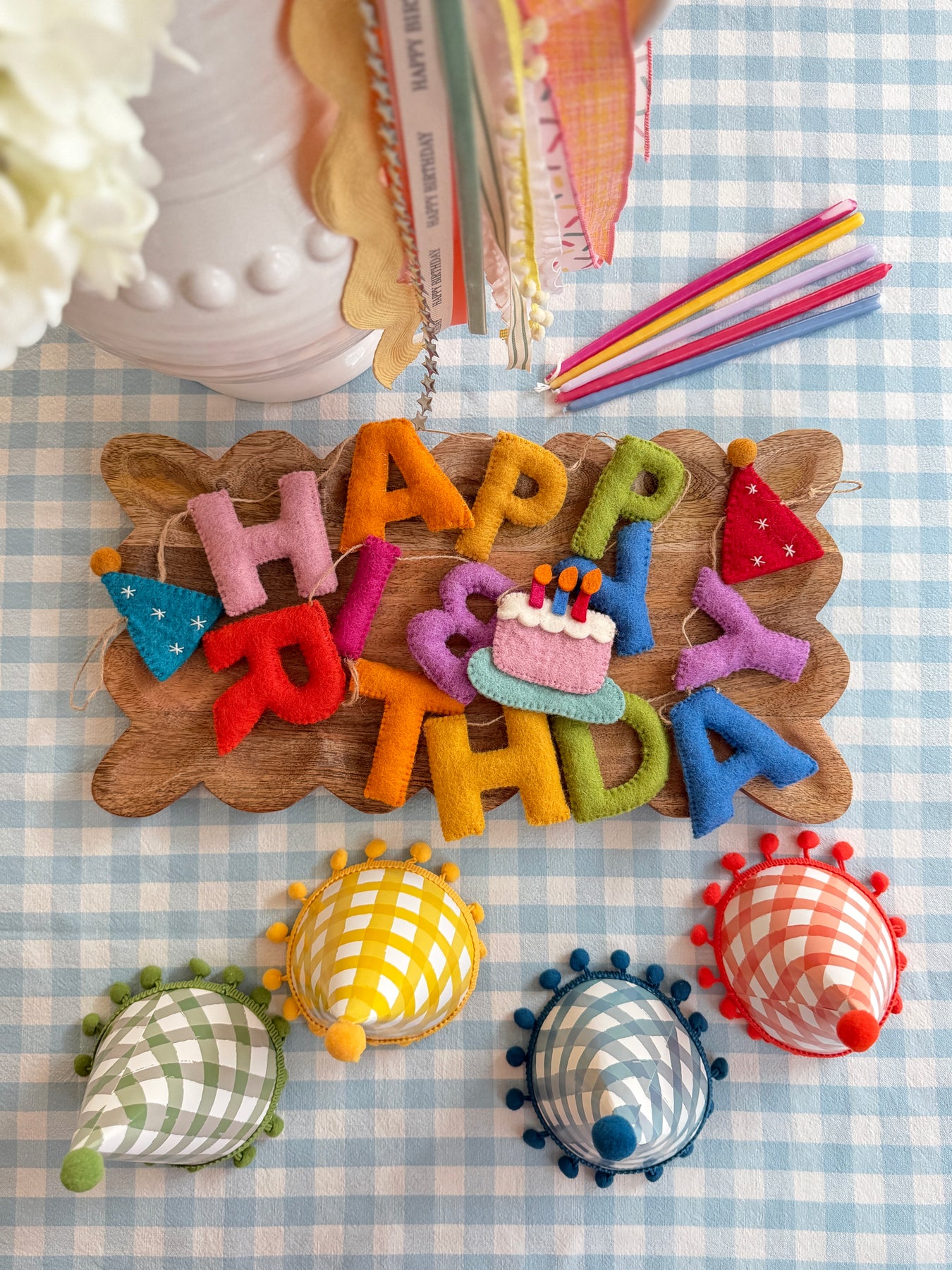 Bright, cheerful, and ready to celebrate, our Happy Birthday Party Banner adds the sweetest pop of color to birthdays big and small. Featuring rainbow felt letters with playful party hats and a darling cake detail, it’s perfect for hanging on a mantel, shelf, doorway, or party table for an instantly festive setup.