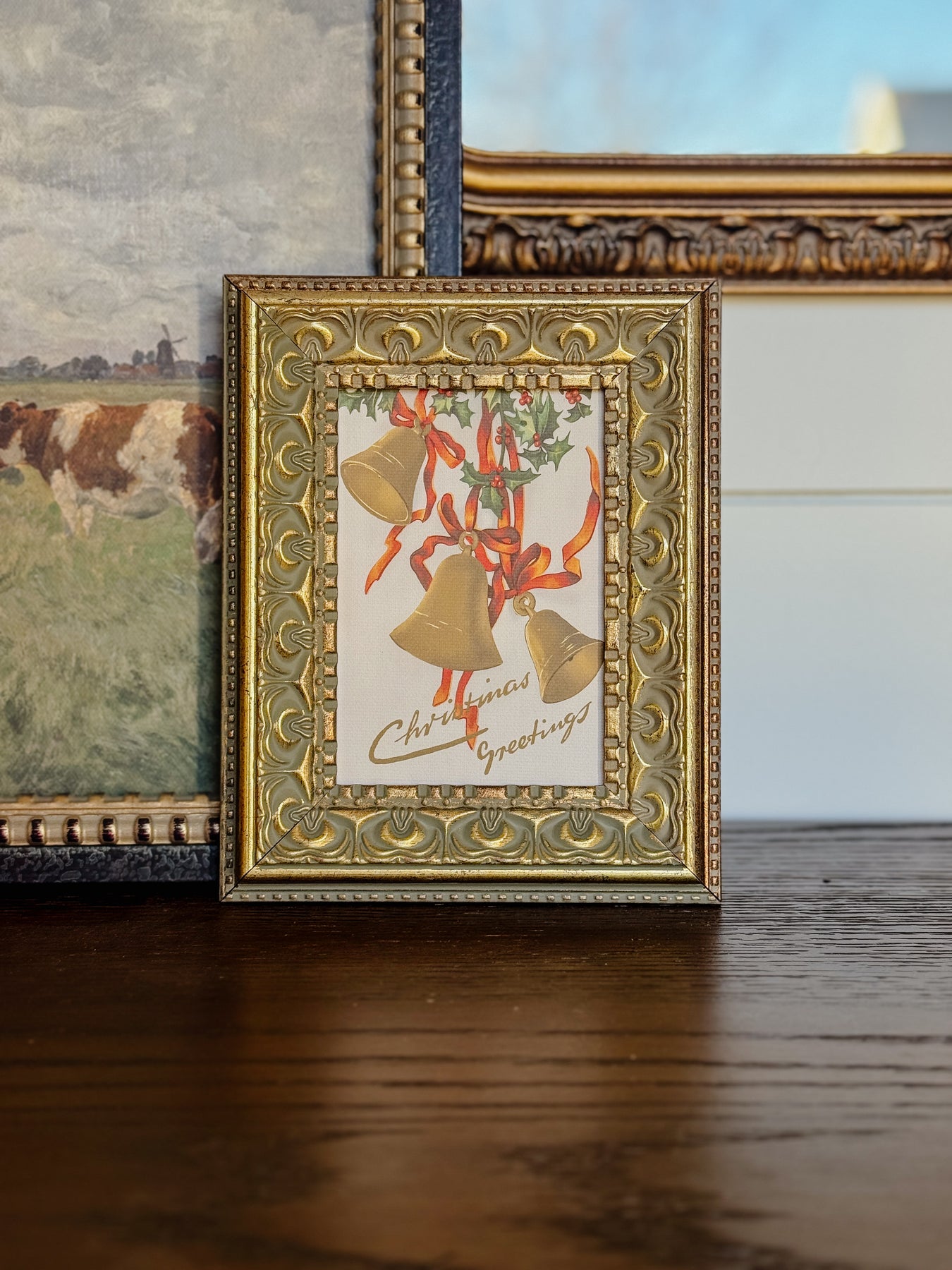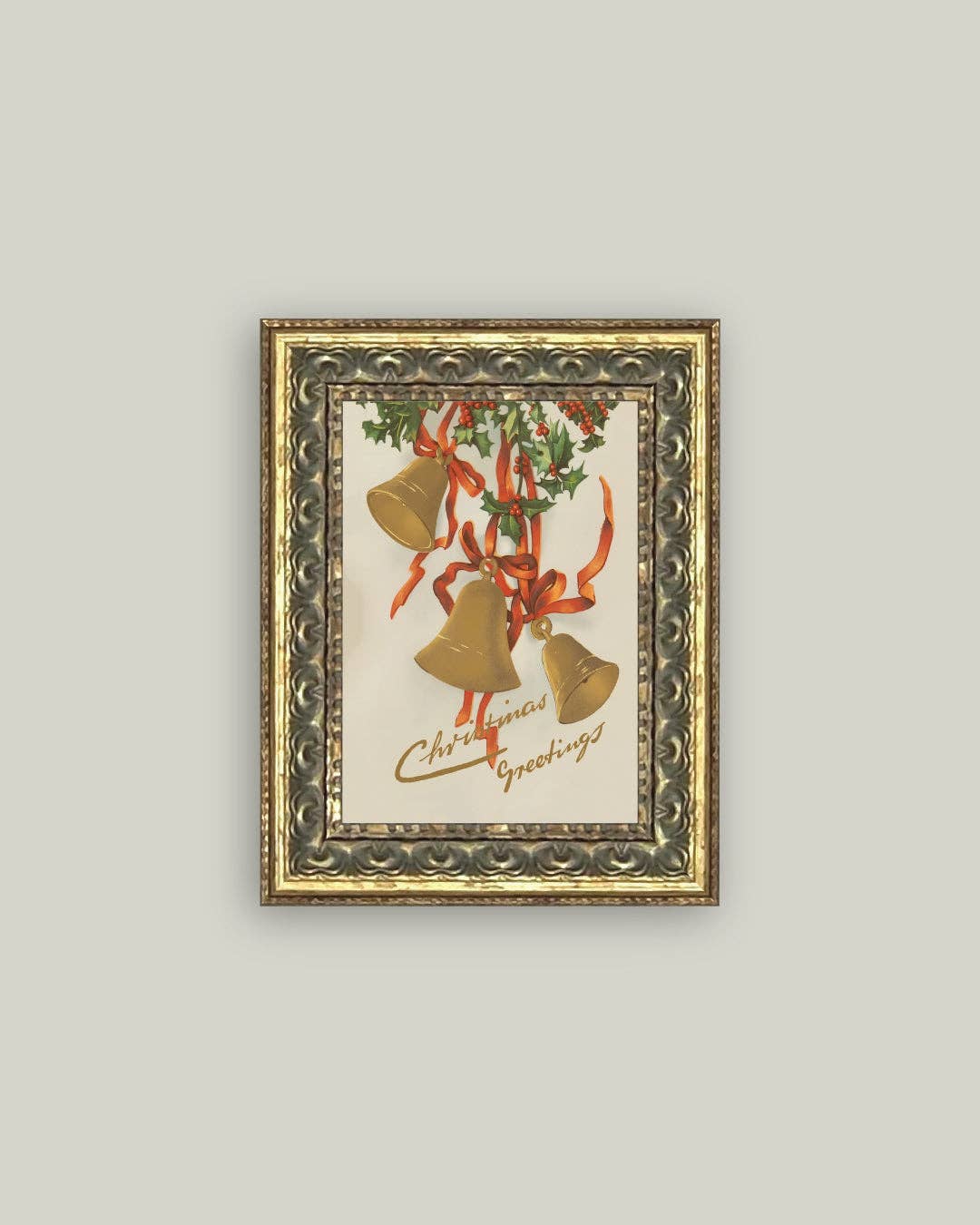 Filled with vintage charm, Christmas Bells celebrates the joyful sound of the holiday season. Golden bells tied with flowing red ribbons and sprigs of holly hang gracefully against a soft, nostalgic background, evoking the look and feel of an old-fashioned Christmas card. The handwritten “Christmas Greetings” adds a timeless touch, making this piece both cheerful and classic.