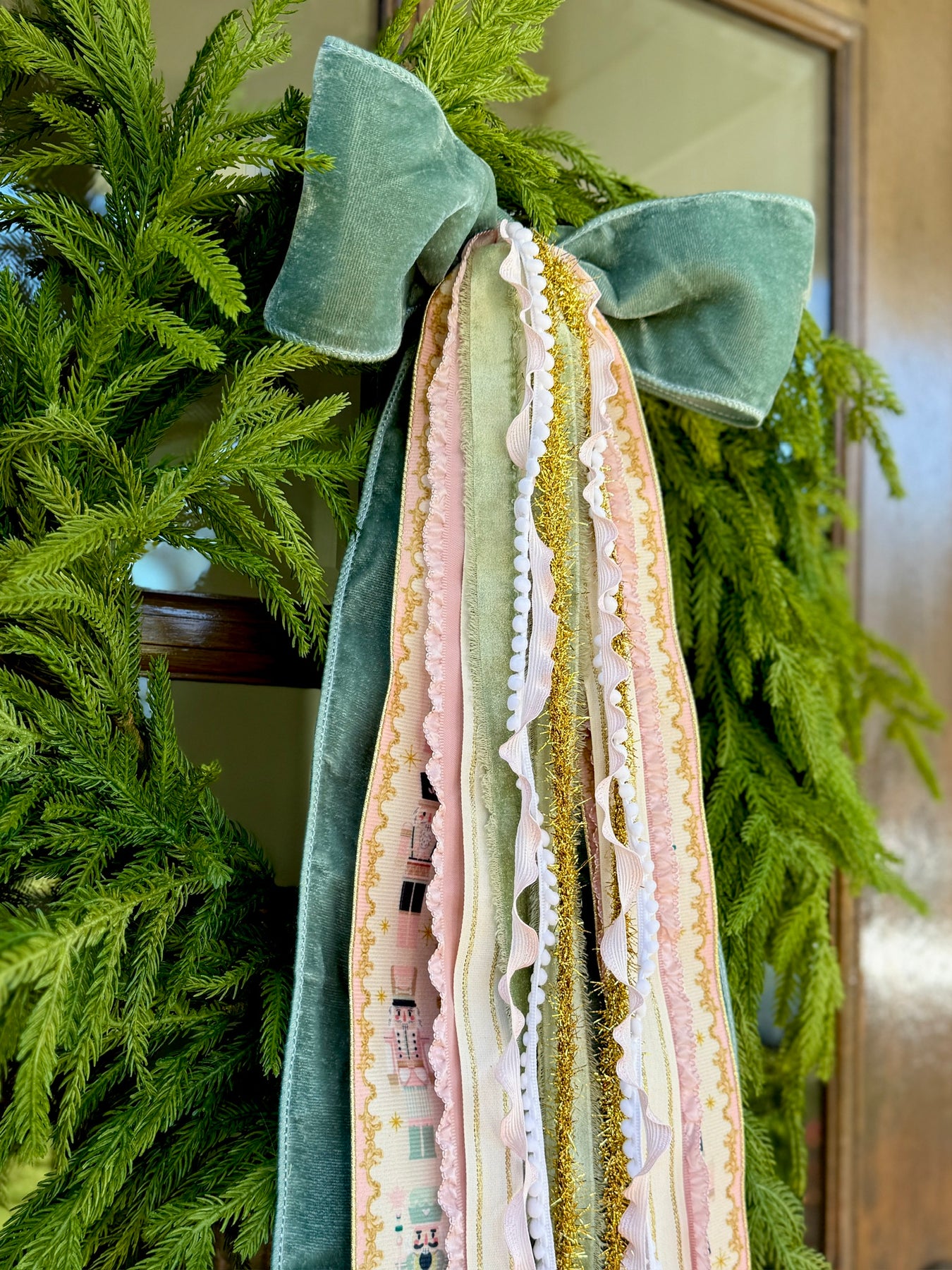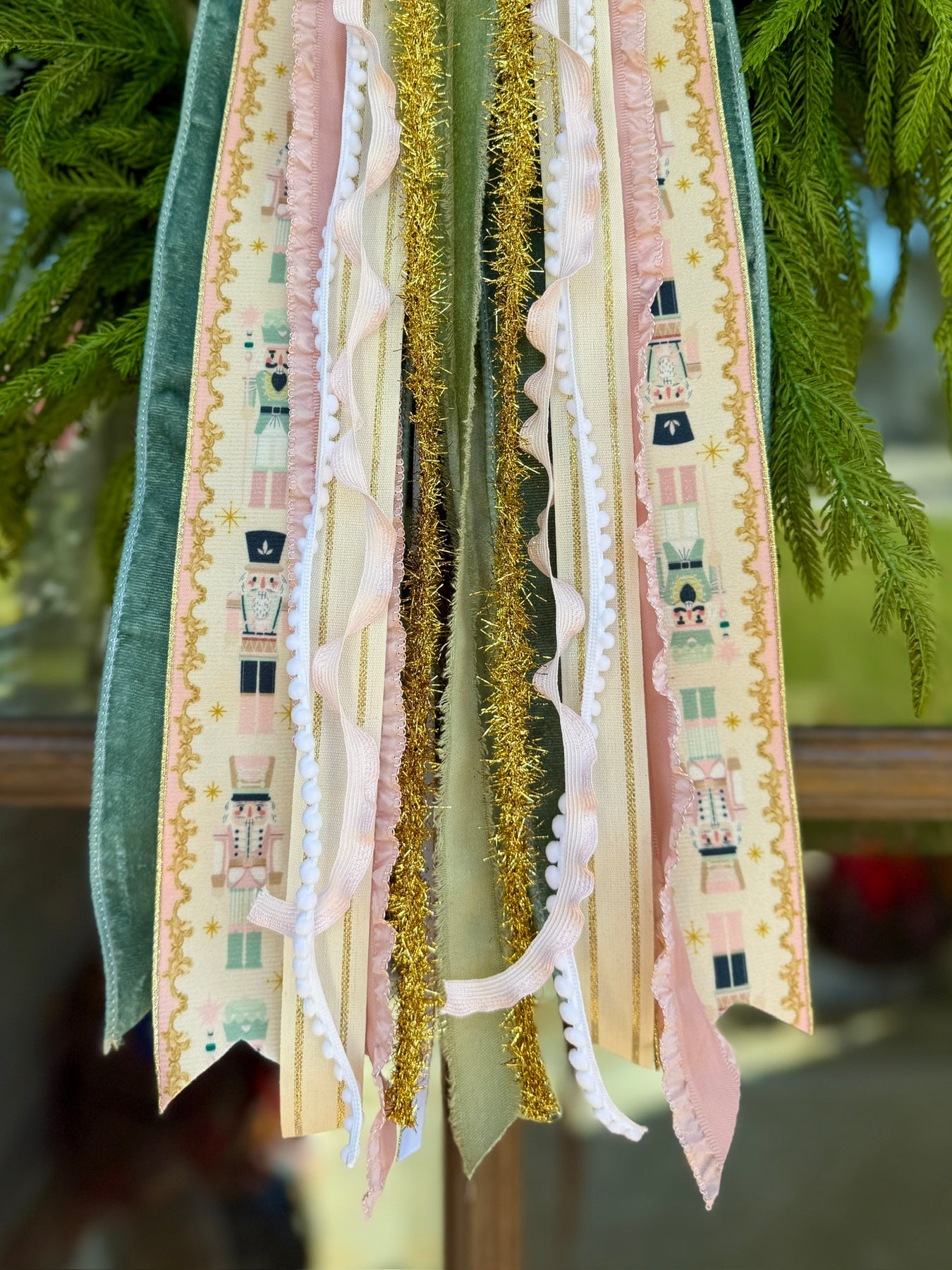 Each ribbon is carefully selected for its texture and grace—from the shimmering gold threads to the dainty ruffled edges and pastel nutcracker print that brings a gentle touch of nostalgia. The effect is ethereal and timeless, evoking the beauty of a holiday waltz beneath twinkling lights.