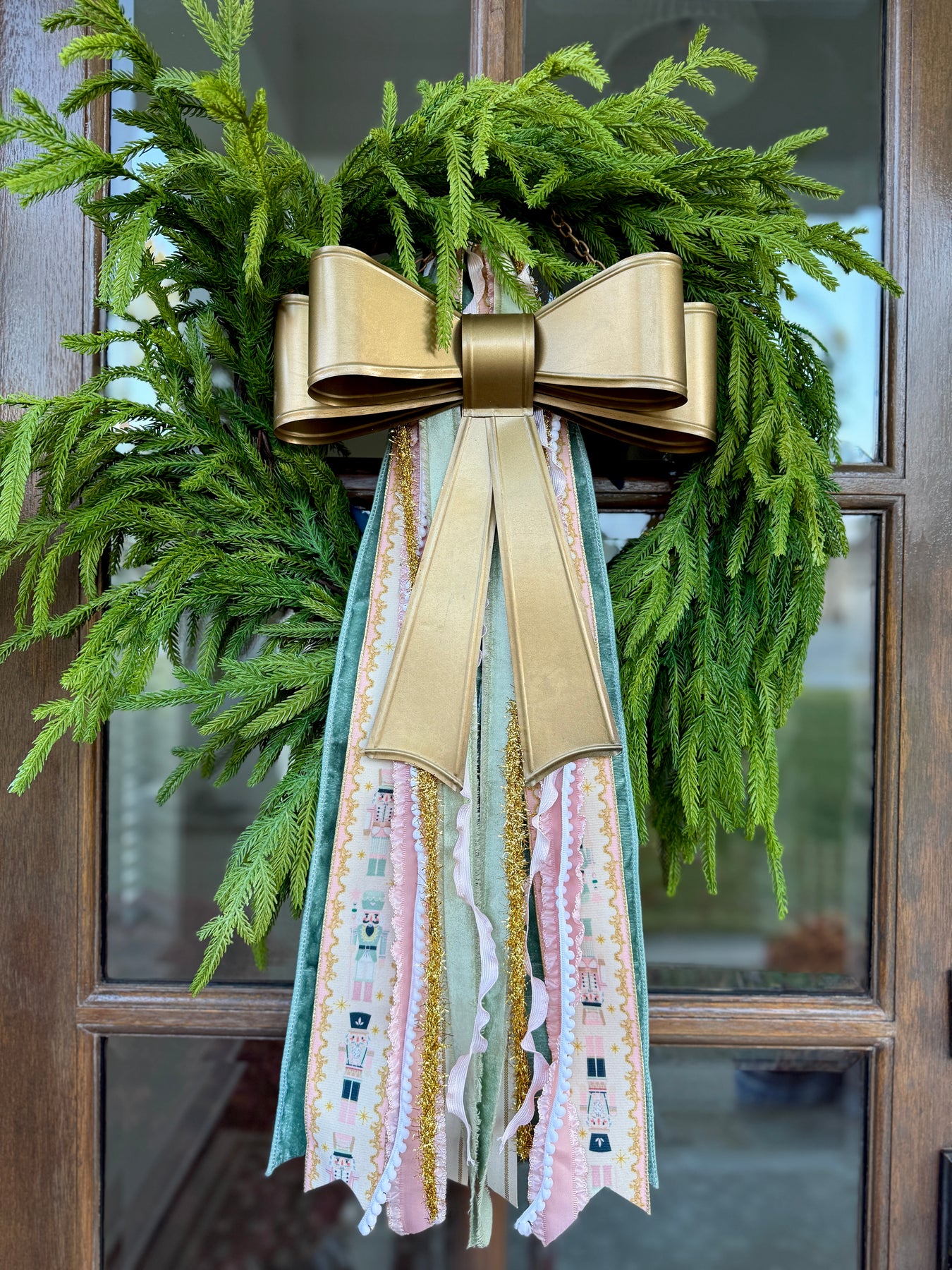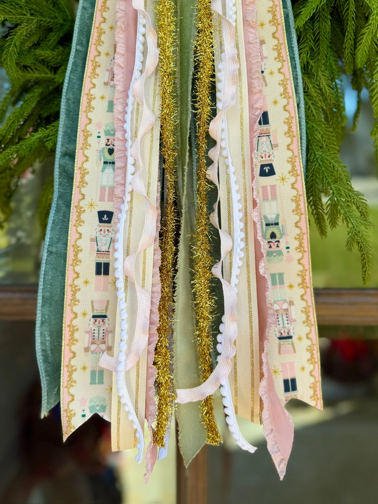 Handcrafted with care, this set features a curated mix of pastel nutcracker prints, gold shimmer trims, and dainty ruffled textures that feel both timeless and unexpected. The soft color palette pairs effortlessly with greenery, making it a beautiful choice for wreaths, garlands, mirrors, or staircases.