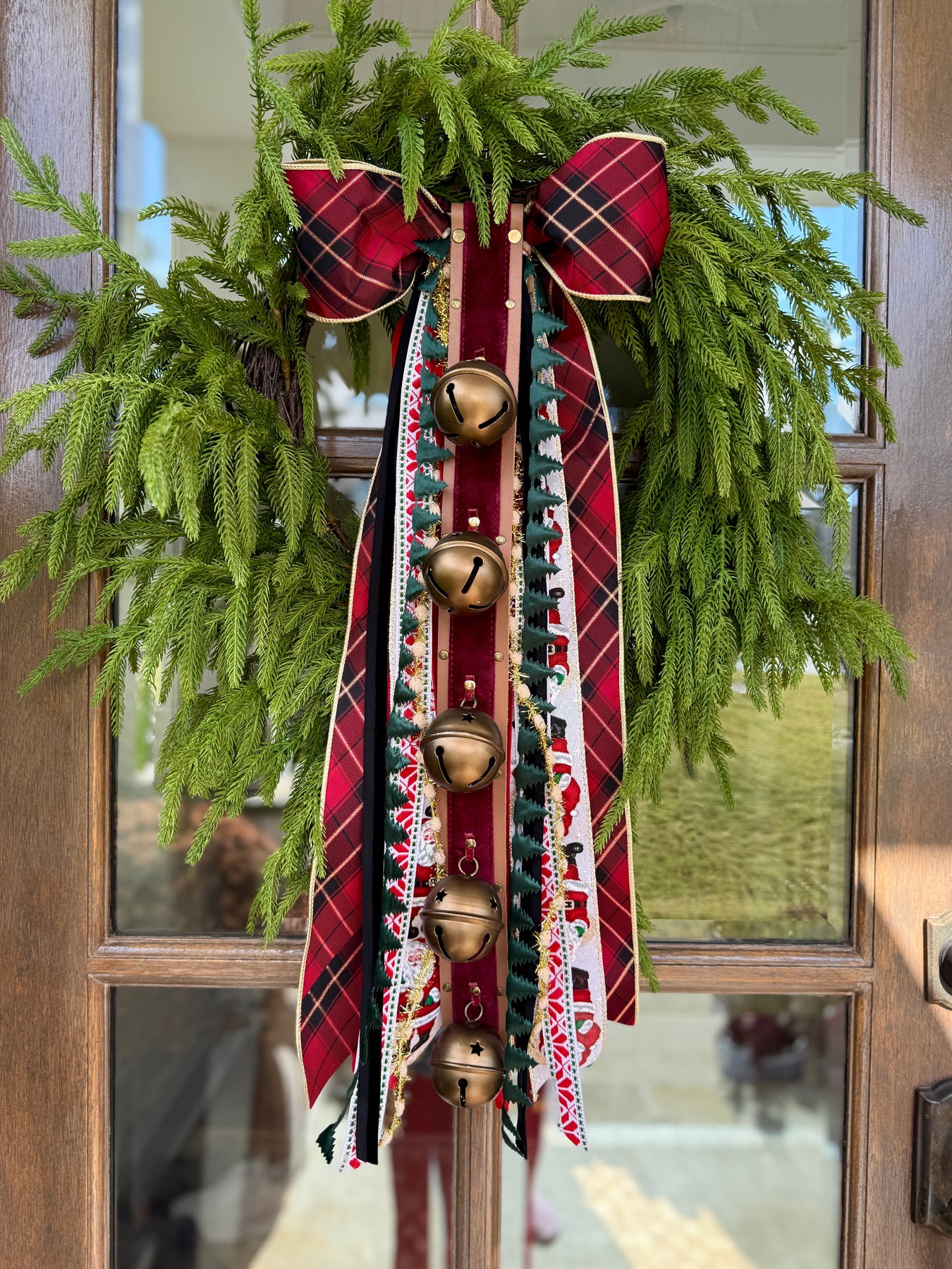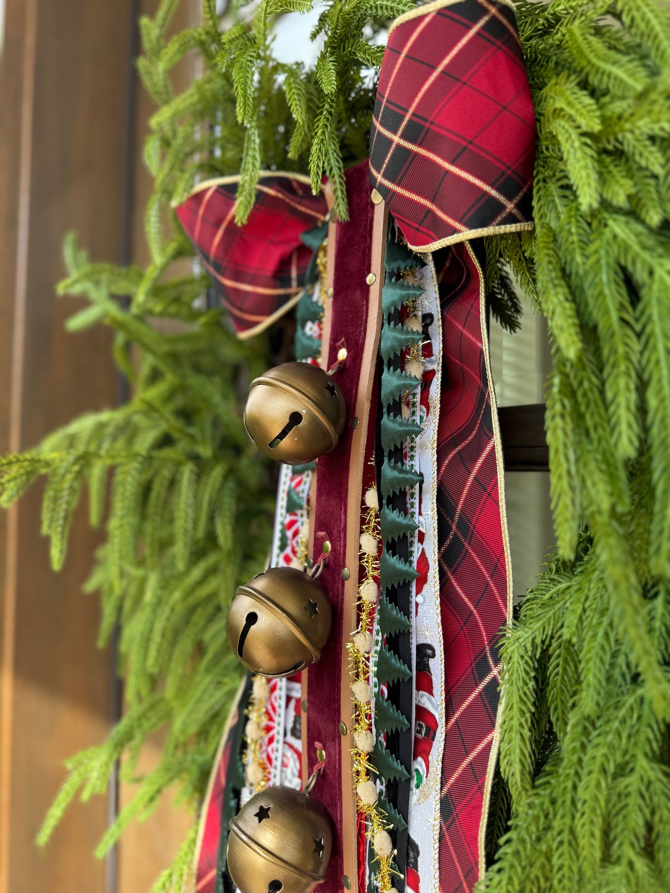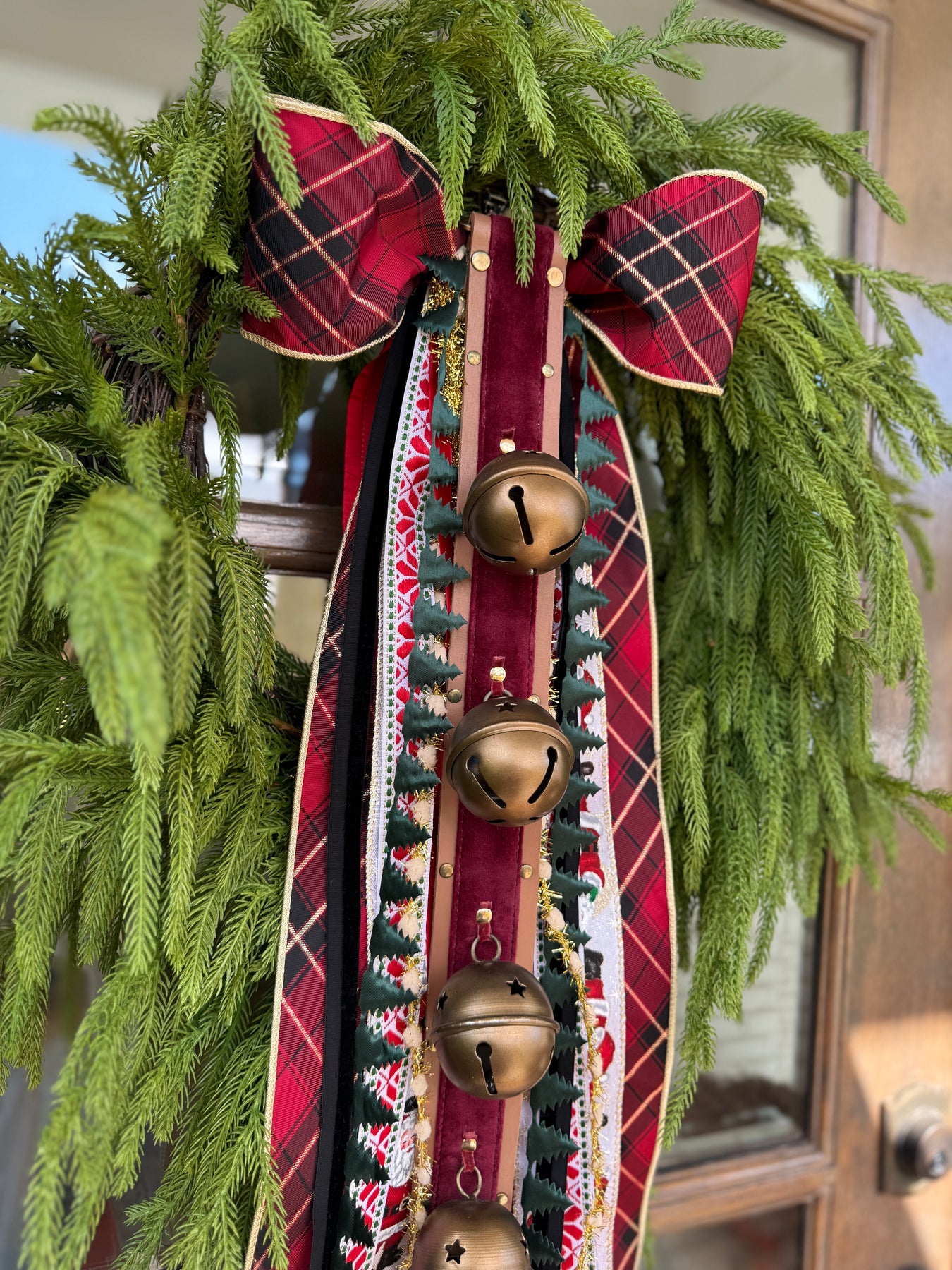 With the soft shimmer of burgundy velvet and the antique gleam of golden metal, Velvet Sleigh Bells Hanger brings a timeless touch to your holiday decor. Crafted with care, this 26" door hanger pairs rich leather loops with two heirloom-style bells that sway gently and evoke the familiar charm of sleigh rides and snowy nights.