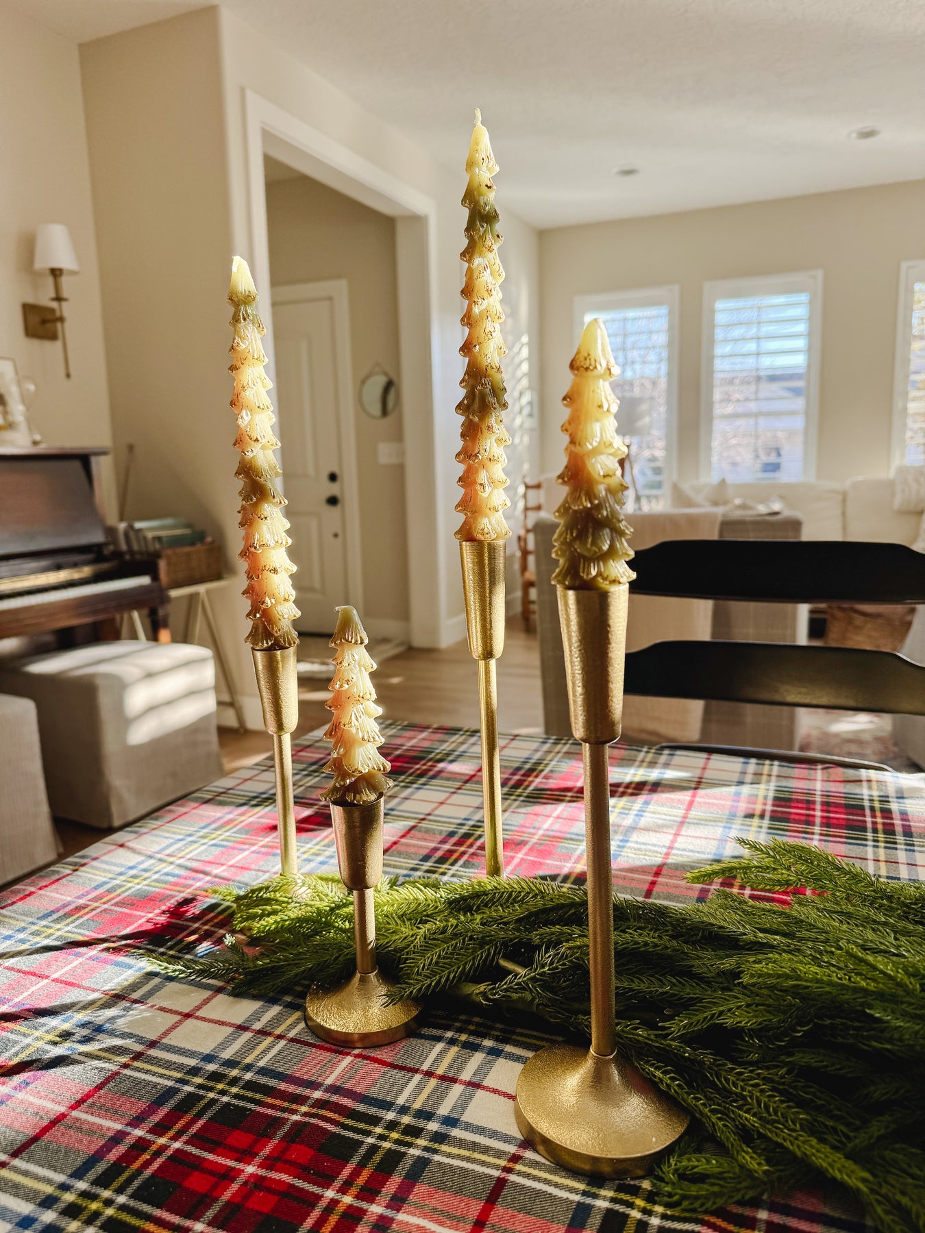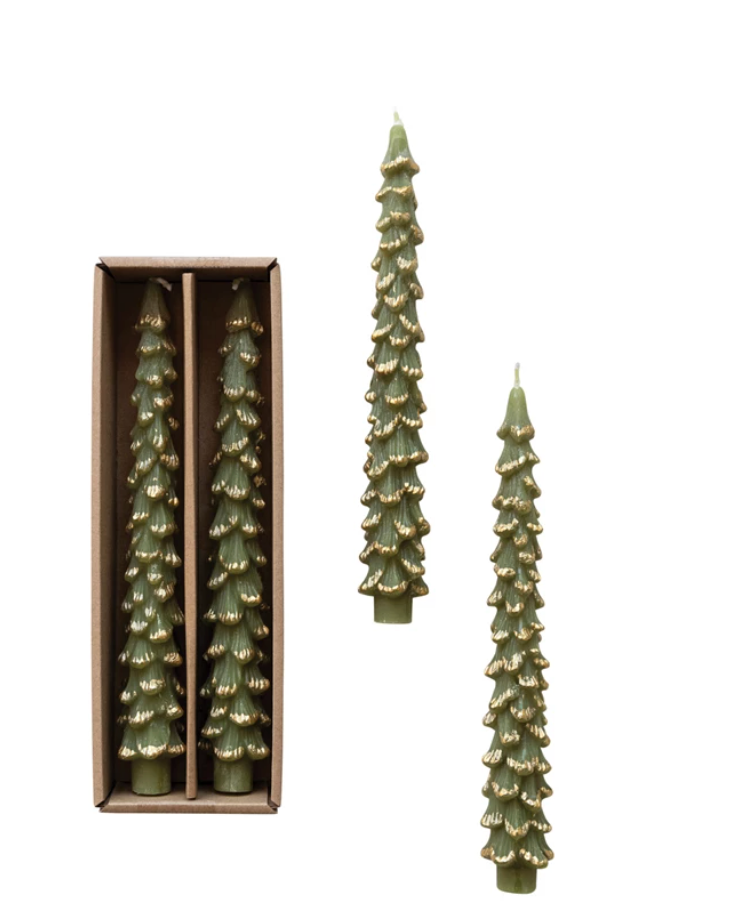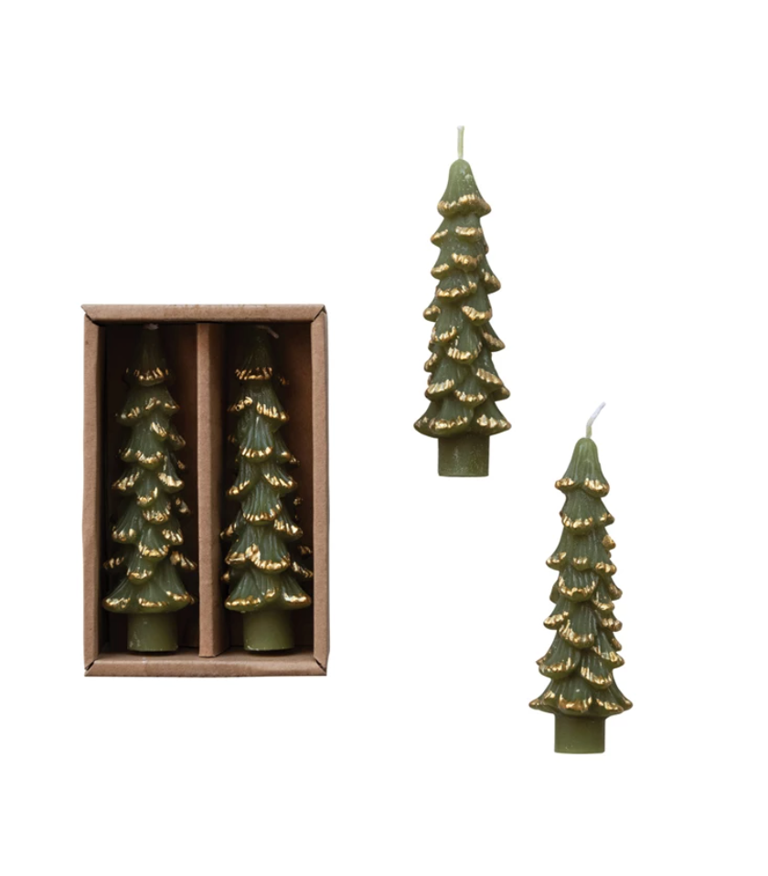 Add a sculptural glow to your holiday mantel or winter tablescape with our Evergreen Tree Taper Candles. Shaped like tall woodland firs and finished with gilded tips, these unscented tapers strike a balance of festive charm and refined elegance—without an overwhelming scent.
