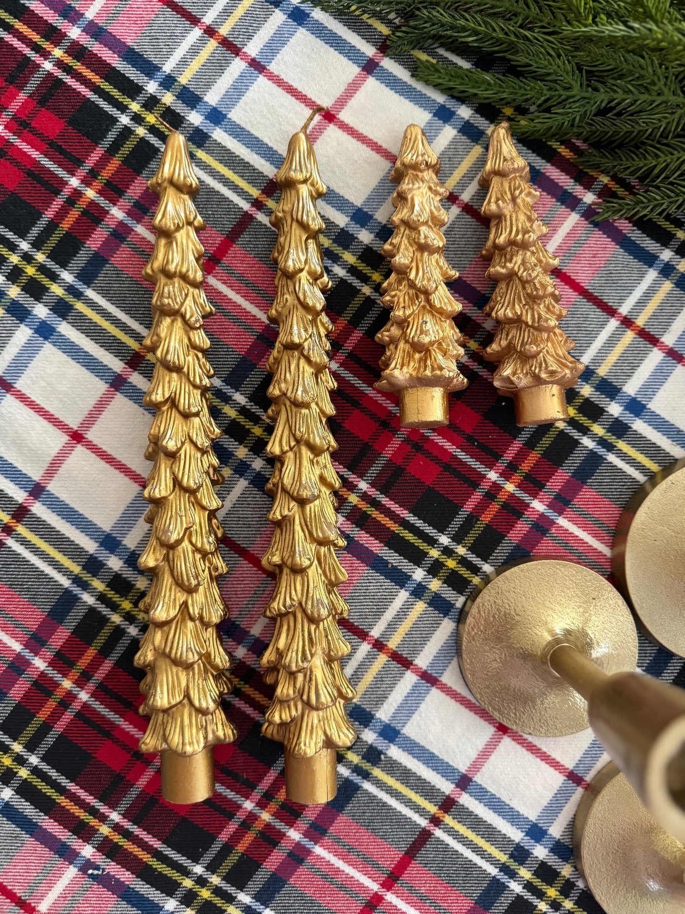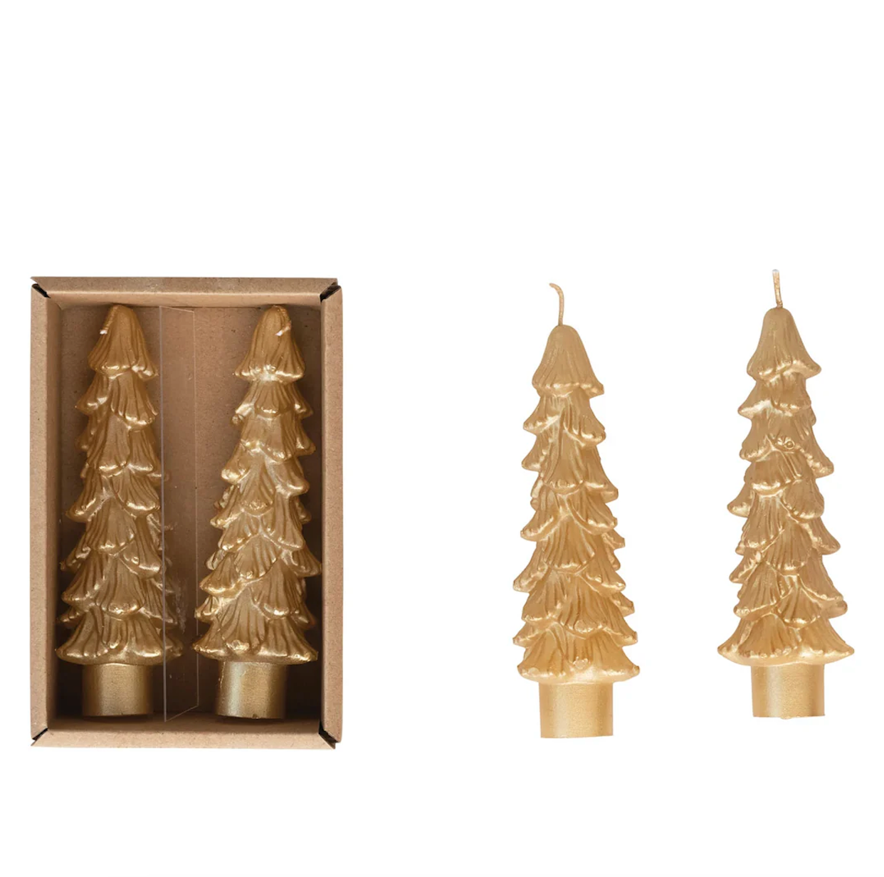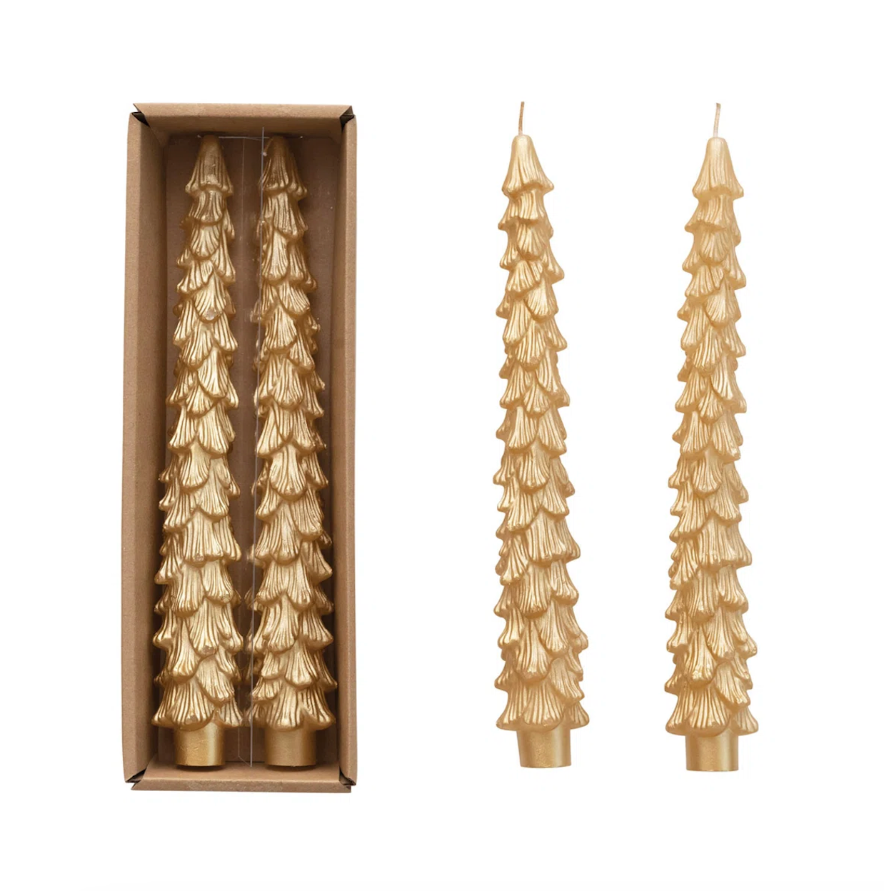 Add a luxe, sculptural accent to your holiday table or mantel with our Golden Spruce Taper Candles. Cast in shimmering gold and shaped like wintery evergreens, these unscented tapers bring radiant elegance and festive warmth—without overwhelming fragrance.