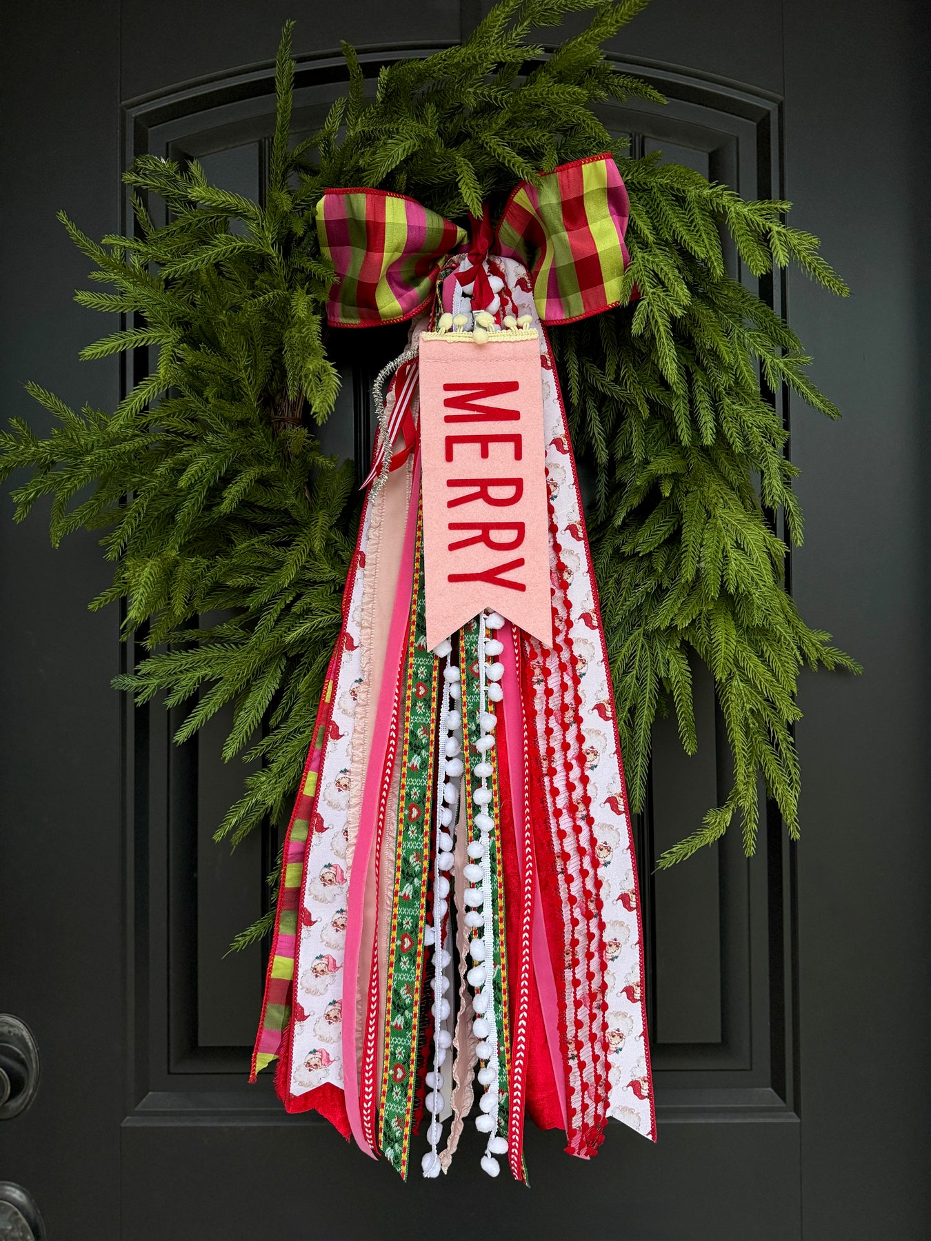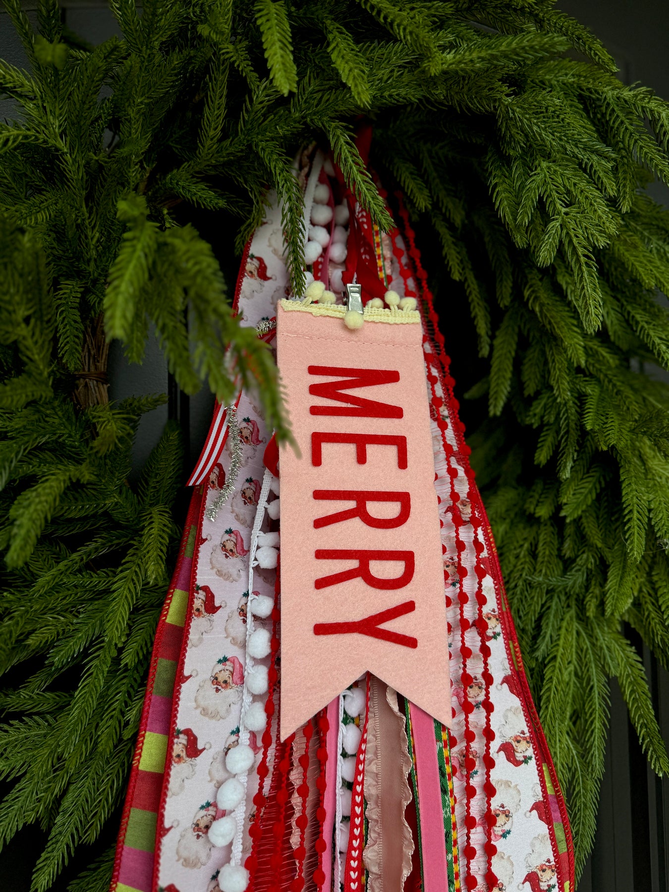 Add a cheerful touch to your Christmas display with our Merry Pennant. This small handcrafted felt flag features bold red lettering on a soft pink base, finished with vintage-inspired pom pom trim and coordinating ribbons for just the right amount of festive flair.