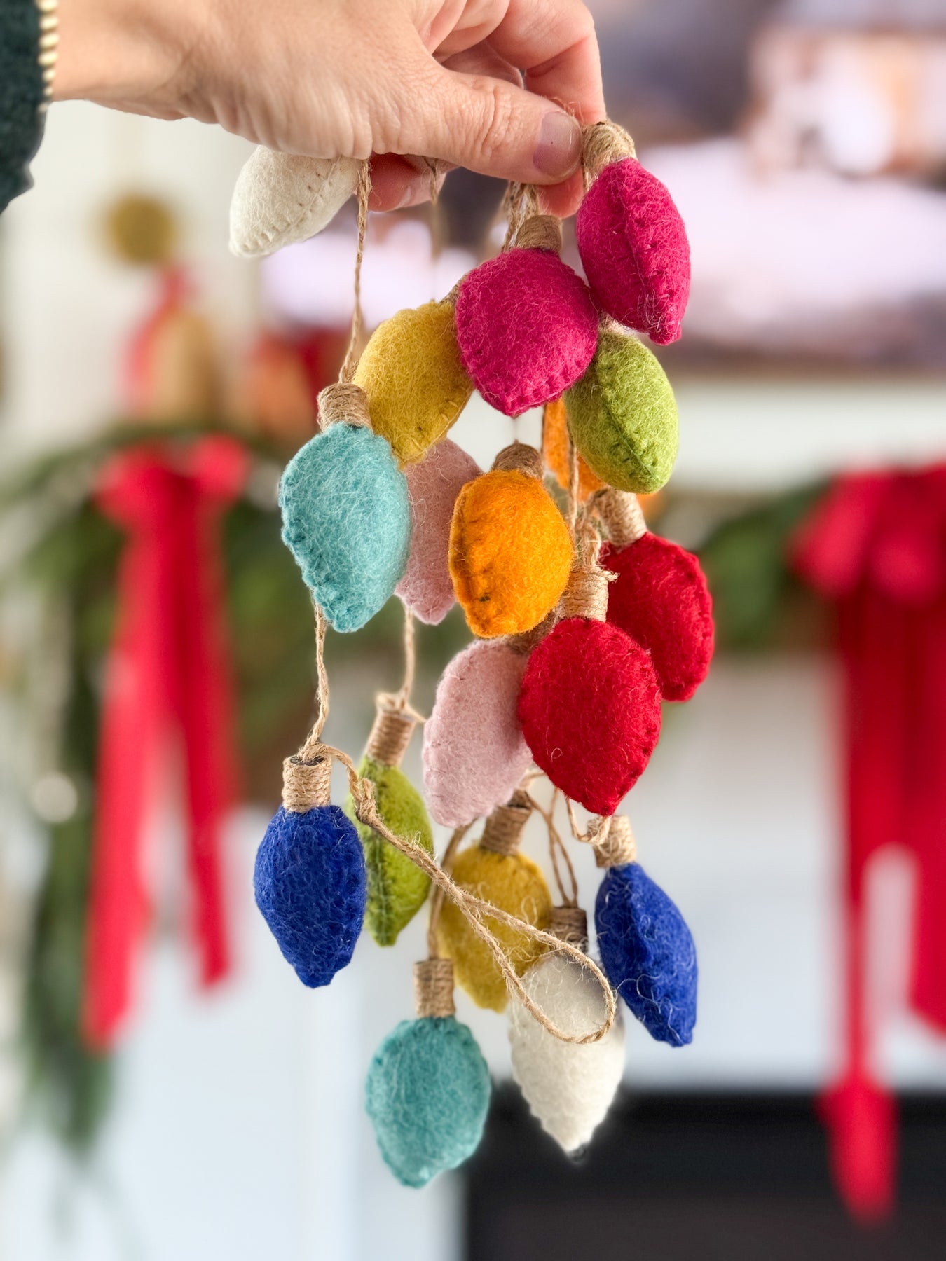 The Holiday Lights Garland is a cheerful strand of handcrafted felt bulbs in bright, festive colors that instantly bring a playful Christmas spirit to any space. Inspired by vintage string lights, each bulb is soft, lightweight, and full of nostalgic charm, making it an easy addition to mantles, garlands, children’s spaces, or holiday shelves.