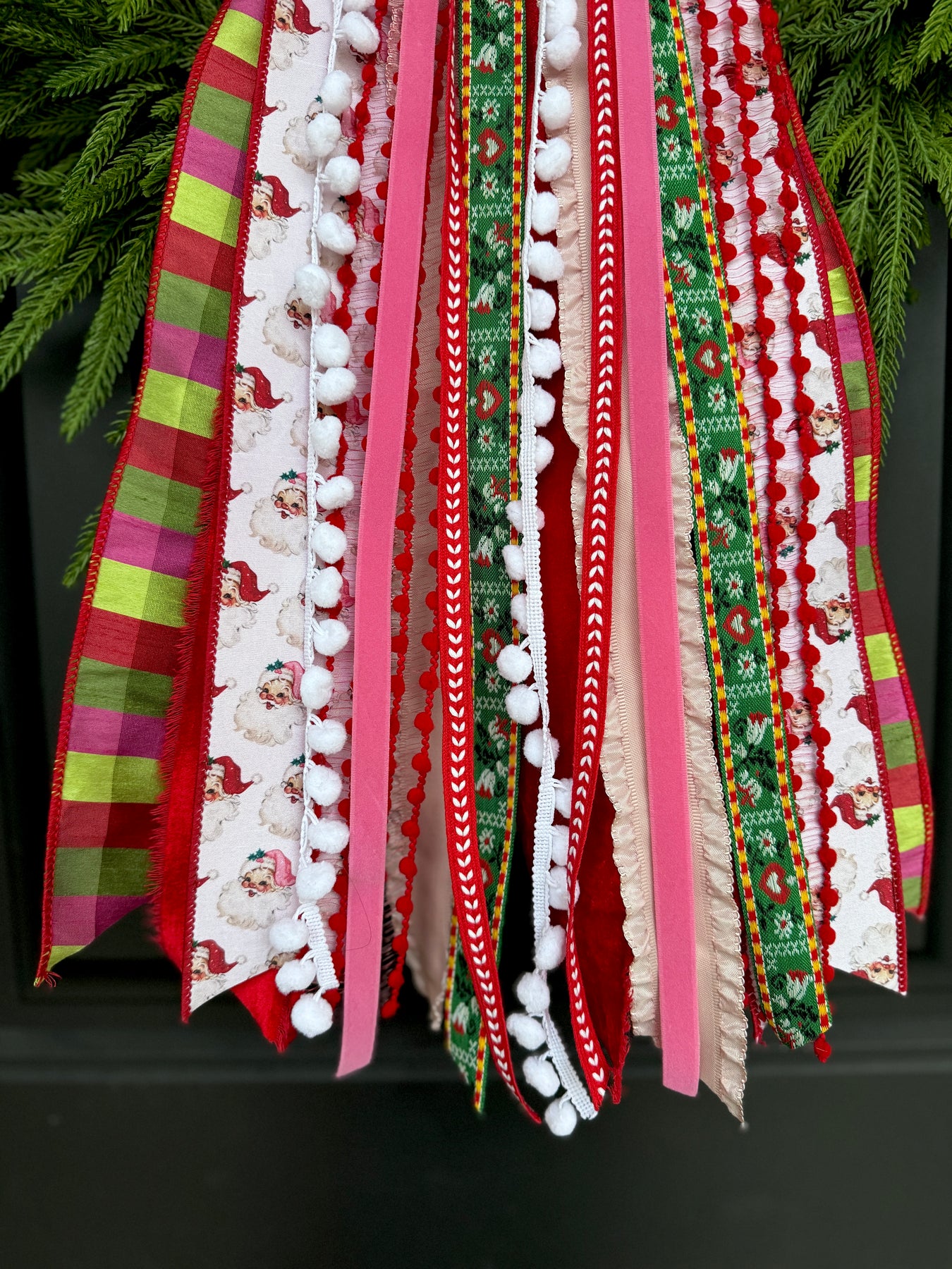 Meet Santa’s Sweetheart Long, a festive ribbon accent where vintage charm meets pink peppermint joy. This handcrafted long ribbon features nostalgic Santa prints, cozy sweater knits, candy stripes, and heart-dotted trims, finished with playful pom poms and soft textures.