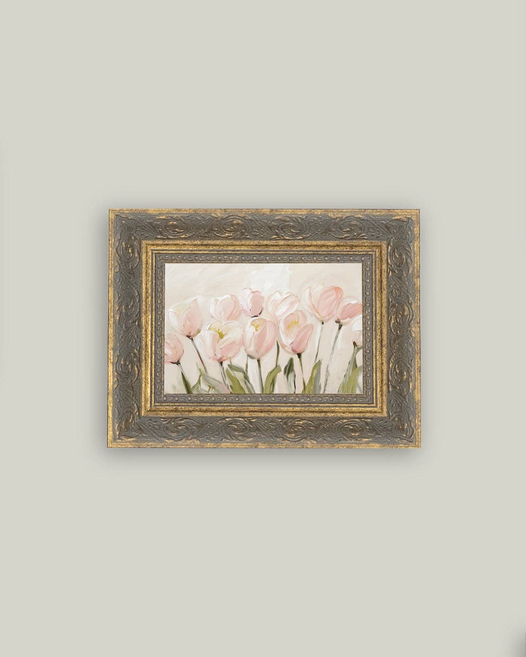 Delicate and timeless, Pink Tulips captures the soft beauty of spring in gentle blush tones and painterly brushstrokes. This antique-inspired floral evokes the quiet charm of fresh-cut blooms arranged on a sunlit morning. Refined, feminine, and effortlessly classic. Its warm, collected feel makes it perfect for Easter styling, layered gallery walls, or adding a subtle touch of seasonal color to your home.