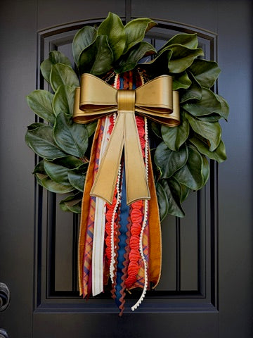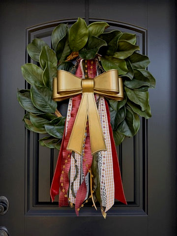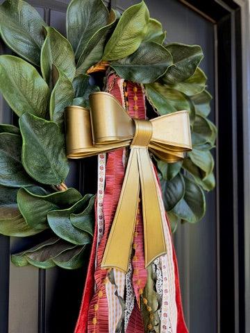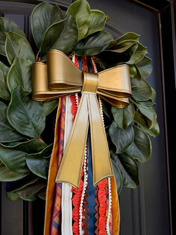 With double-layered loops for dimensional detail and an aged metallic finish, this piece pairs beautifully with any of our Long style ribbon sets. Layer it over lush greenery or fresh magnolia wreaths for a stunning display, or style it solo for a bold, elegant look.