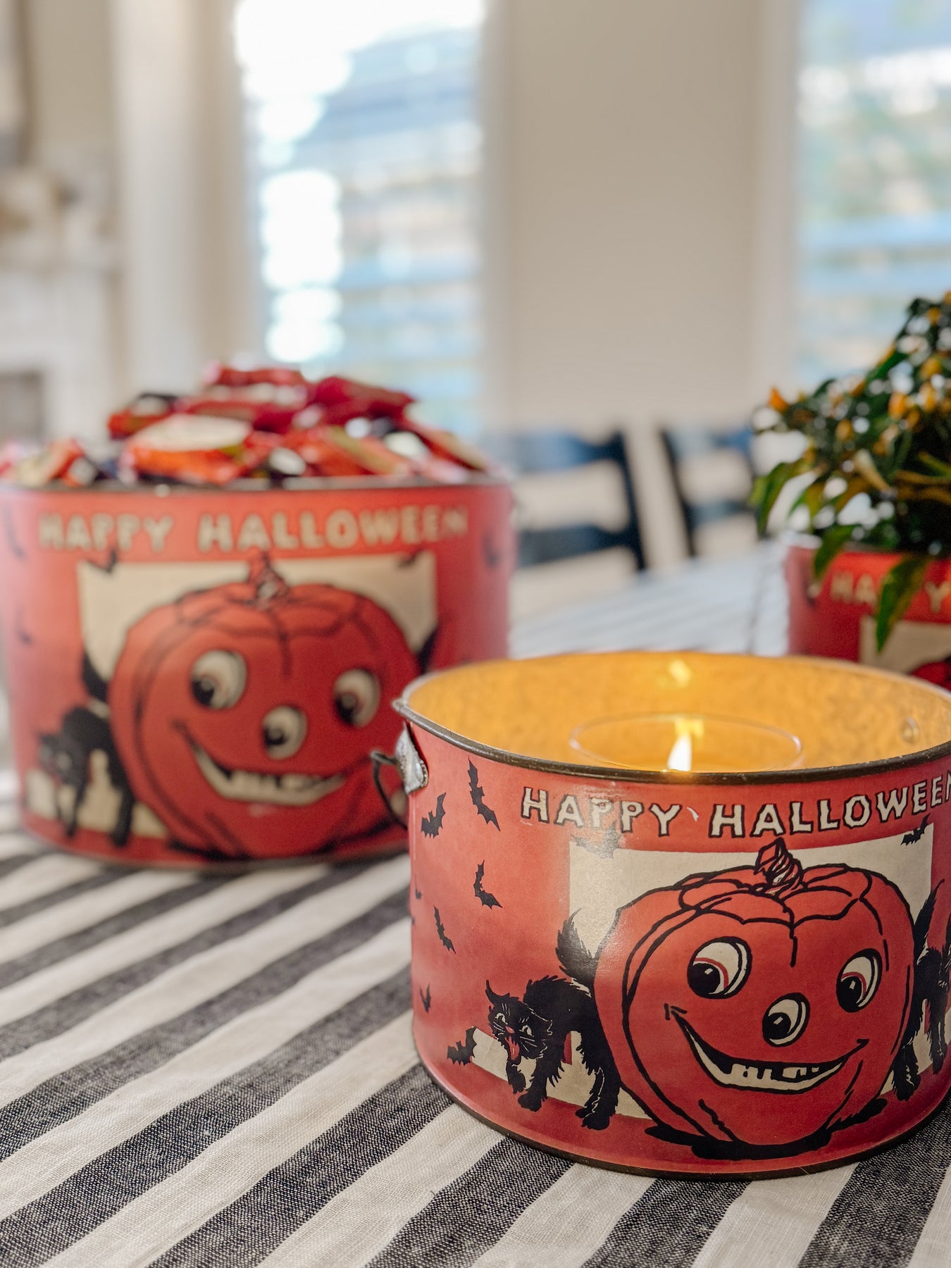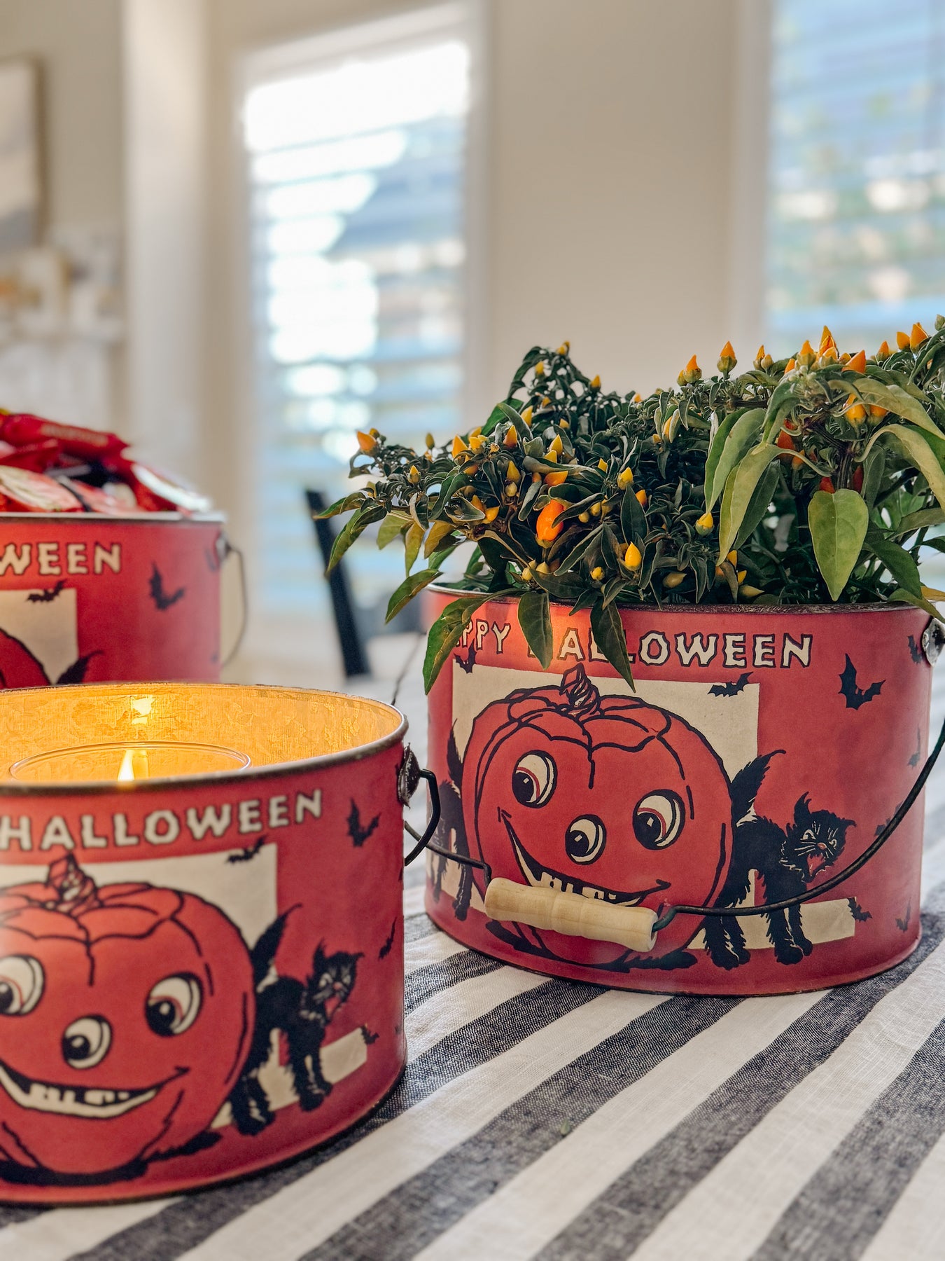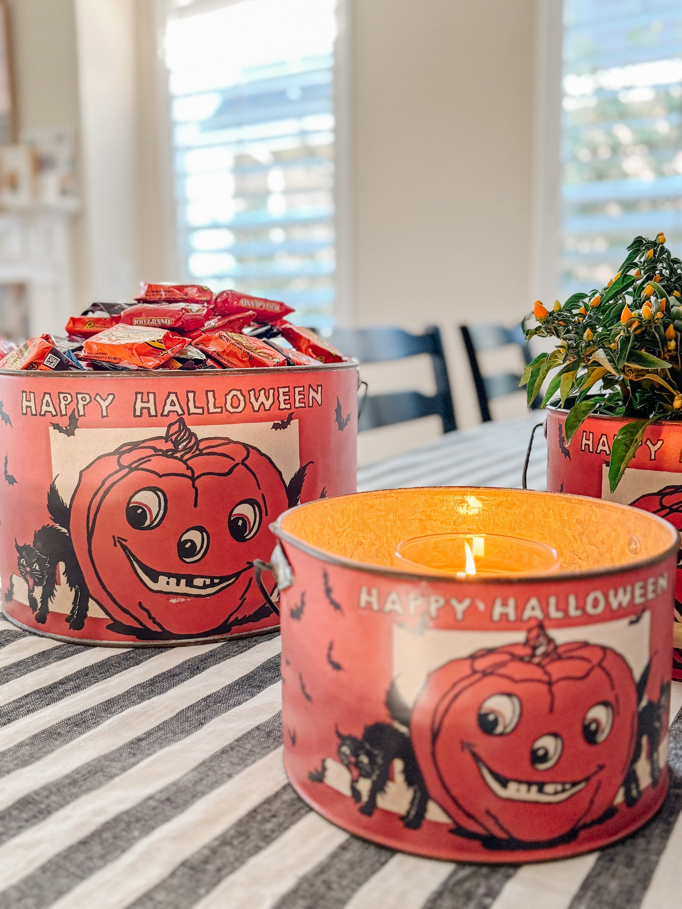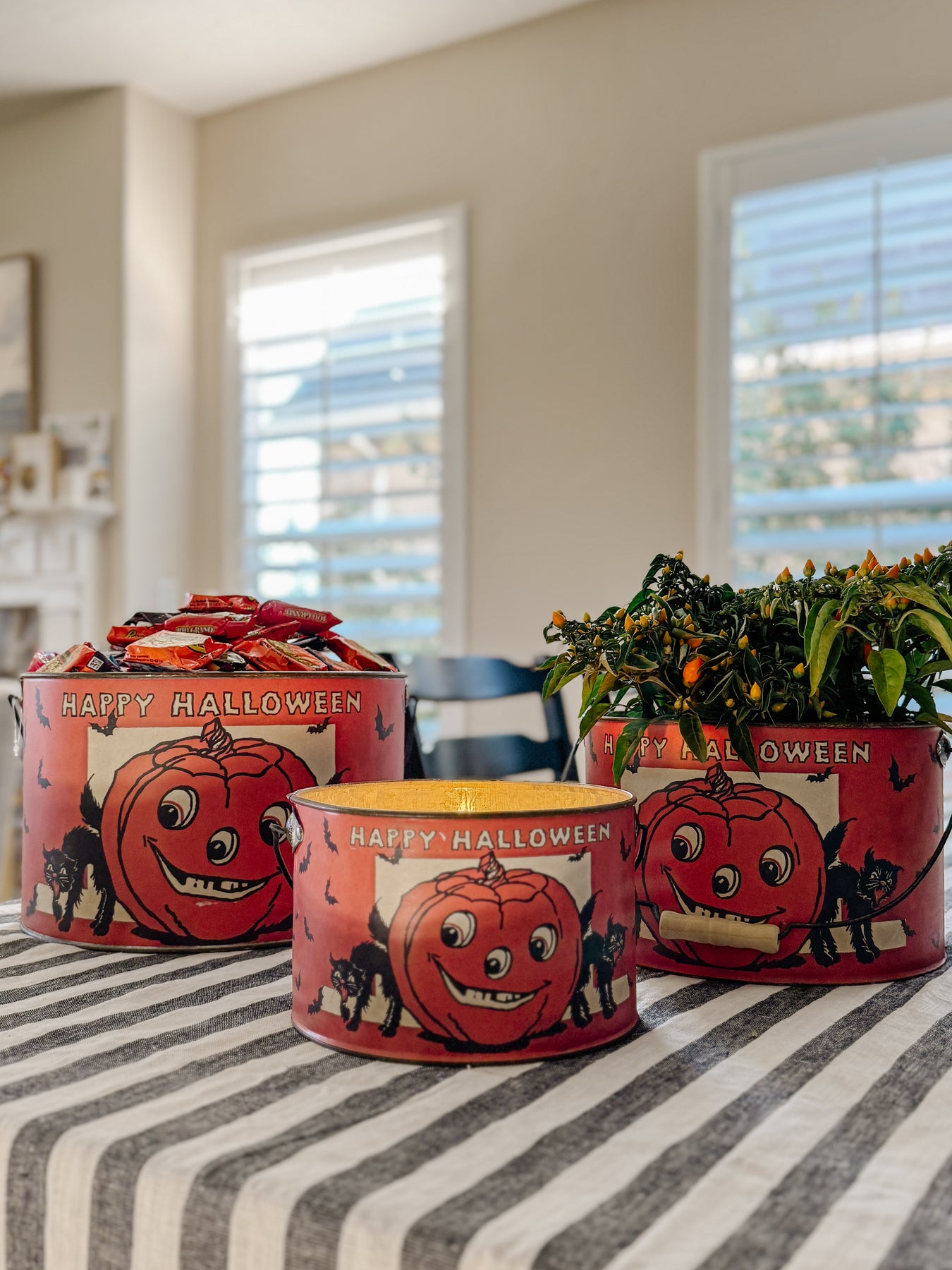 Bring nostalgic charm to your Halloween decor with our Vintage Halloween Bucket Trio. This collectible set includes three galvanized metal buckets in graduated sizes, each featuring cheerful wrap-around graphics of grinning jack-o'-lanterns, black cats, fluttering bats, and “Happy Halloween” sentiments in retro-inspired typography.