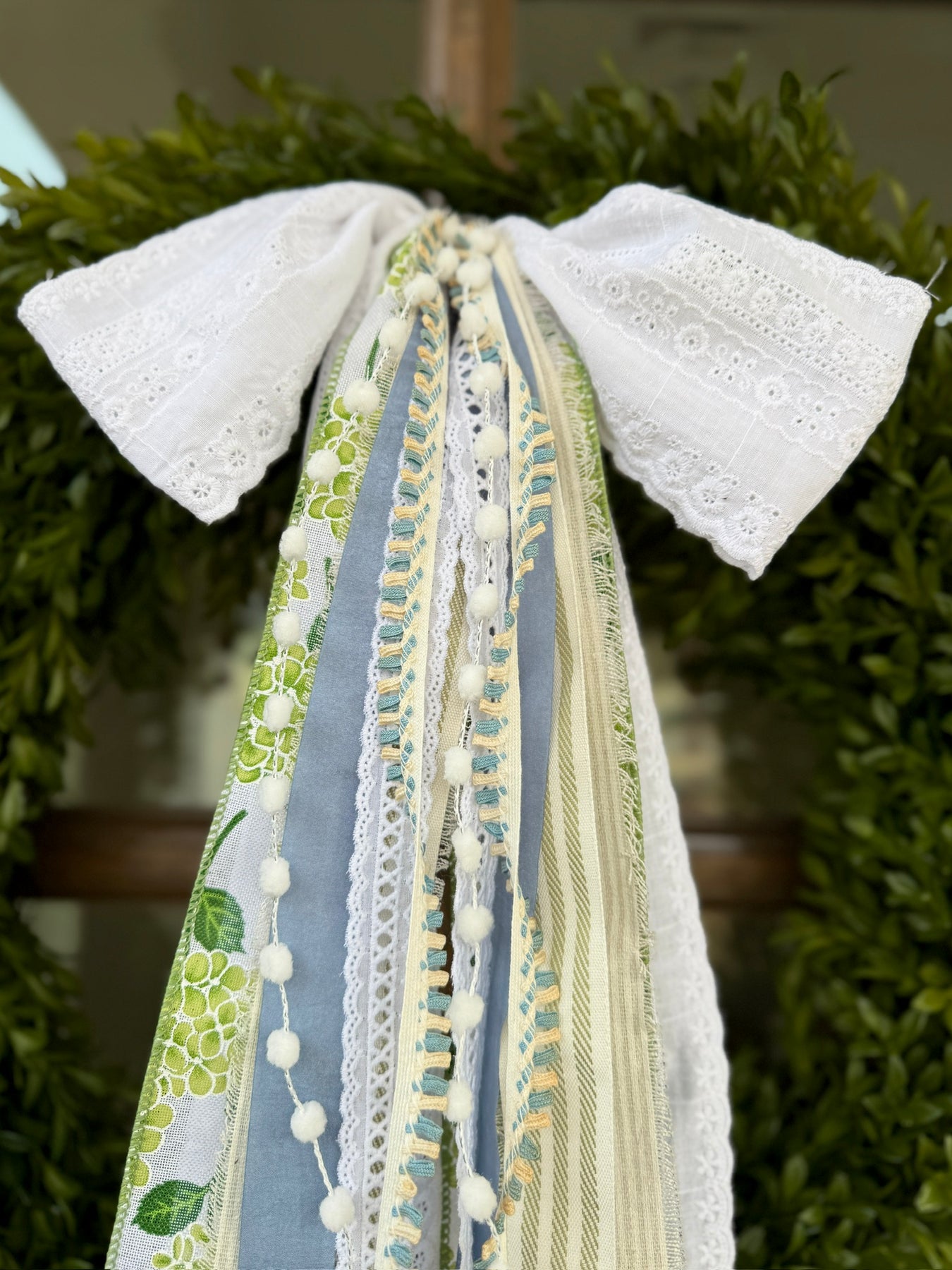 Light, airy, and effortlessly pretty, our Cottage Breeze Designer Bow brings a soft spring touch to your front door wreath. With crisp creams, gentle blues, fresh green details, and delicate lace-inspired textures, it creates a clean, layered look that feels calm and classic.