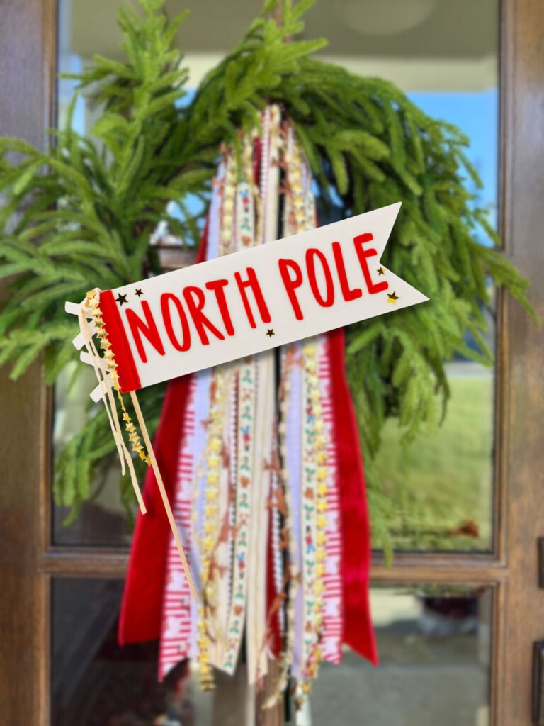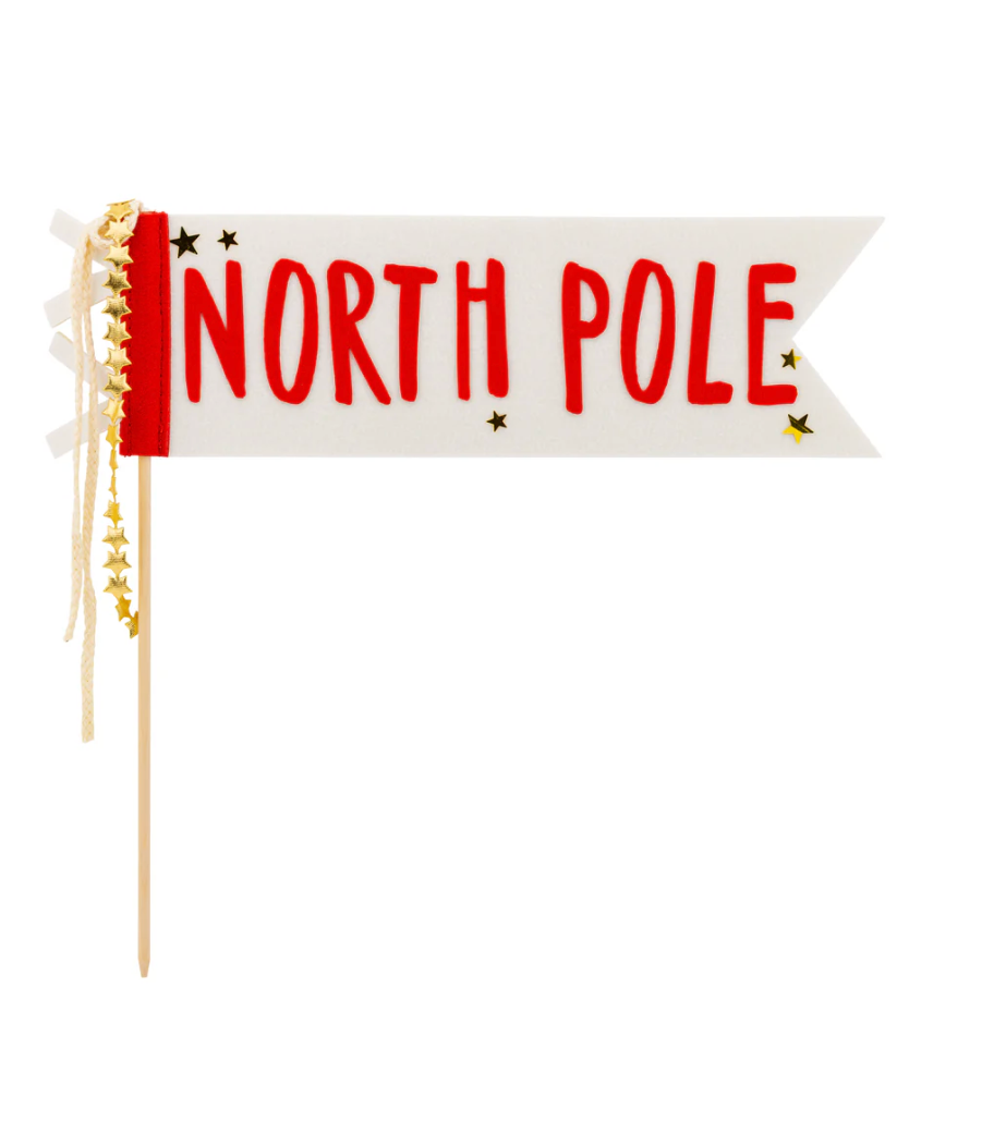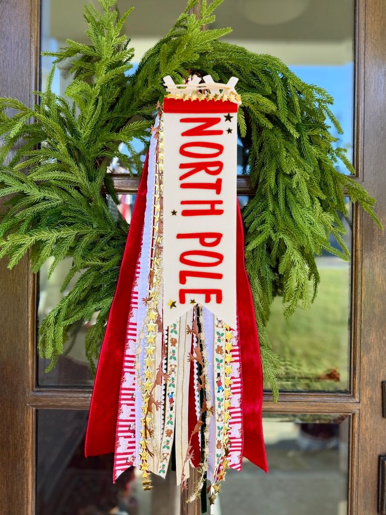 Add a playful holiday touch with our North Pole Pennant. Featuring bold red lettering, golden star accents, and whimsical trailing ribbons, this handcrafted felt flag brings cheerful charm to wreaths, doorways, and tabletop displays.
