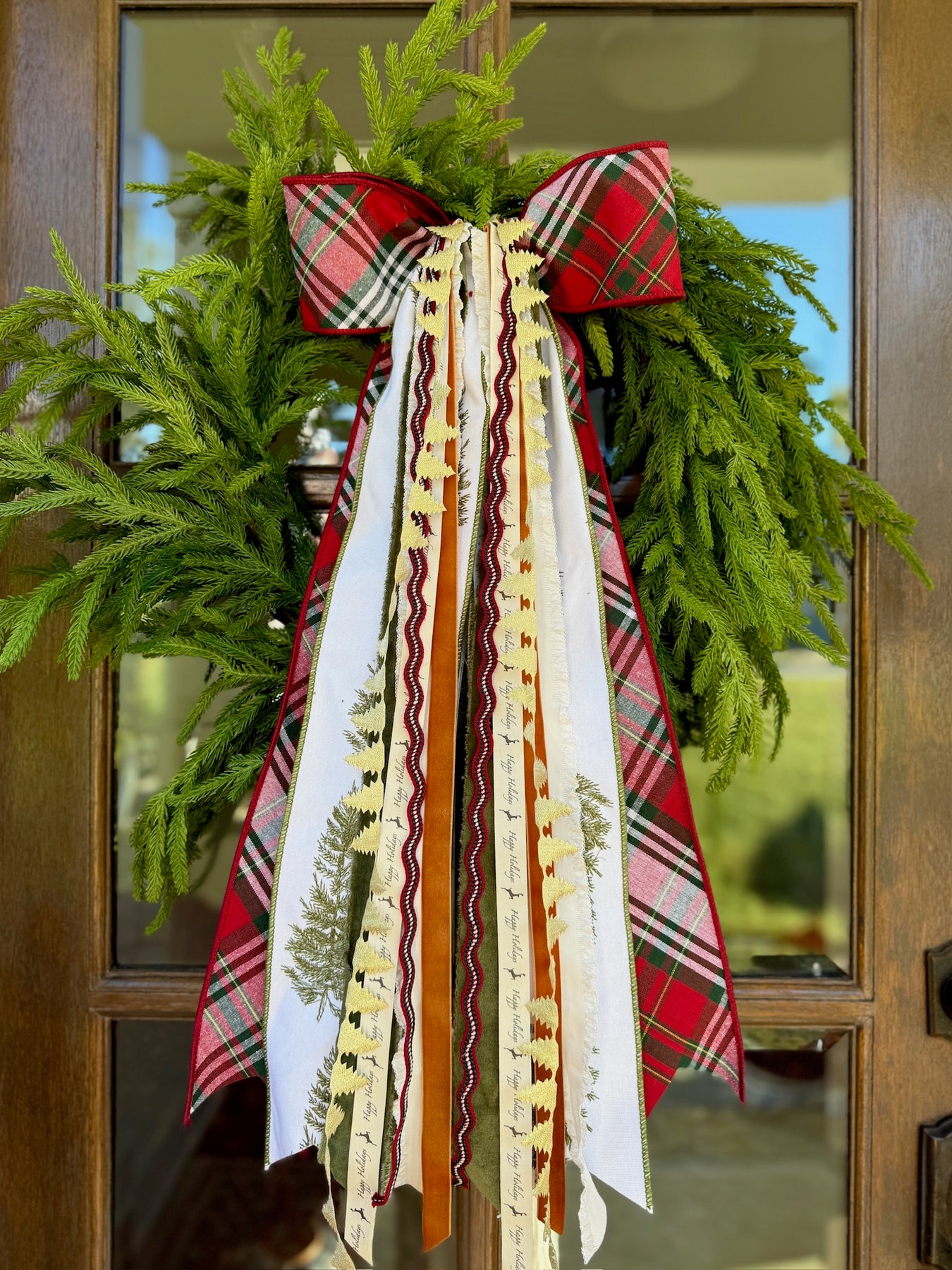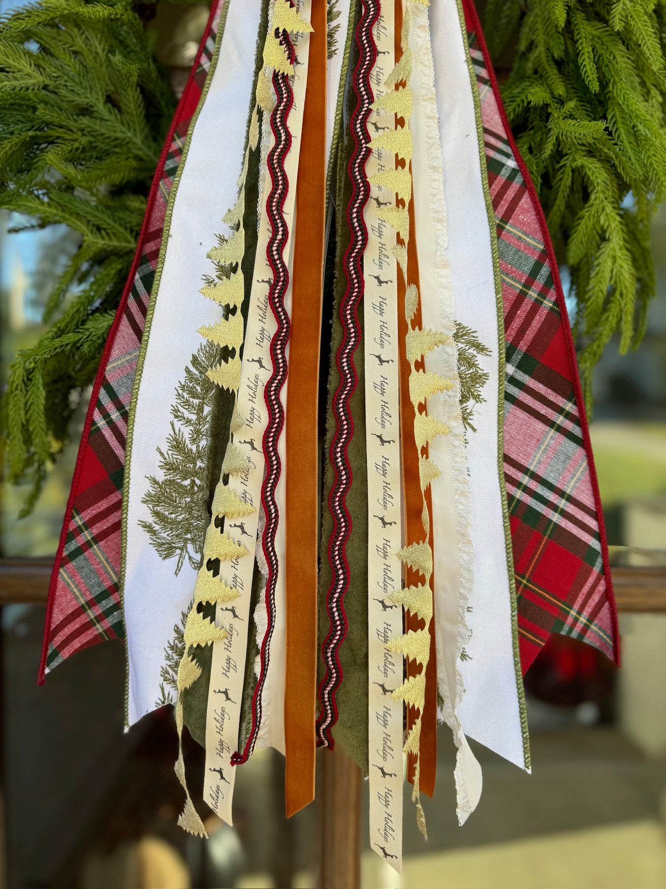 Meet Highland Pines — a ribbon set inspired by cozy mountain lodges and evergreen forests. Featuring a double 4" base of rich tartan plaid and embroidered pine trees, this design layers lush velvet, gold accents, and classic holiday trims for a look that’s both nostalgic and refined. Each ribbon tells its own story, from stitched evergreens to vintage rickrack, making this bow a timeless piece for your holiday door, wreath, or mantel.
