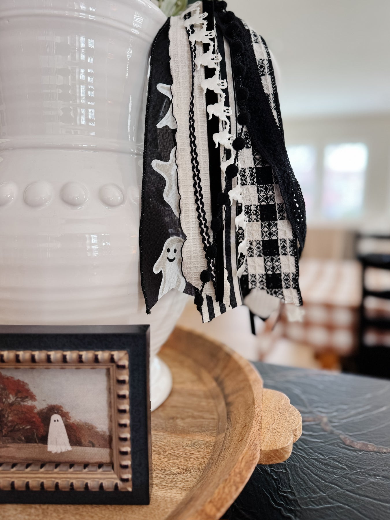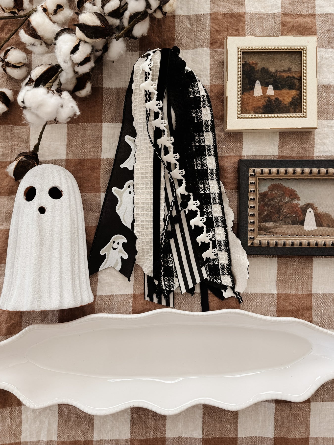 Small in size but big on charm, The Friendly Ghost Mini is the perfect playful accent for your Halloween décor. With its cheerful ghost print, bold black-and-white patterns, and textured details, this ribbon brings a sweetly spooky vibe to lanterns, small wreaths, baskets, and more.