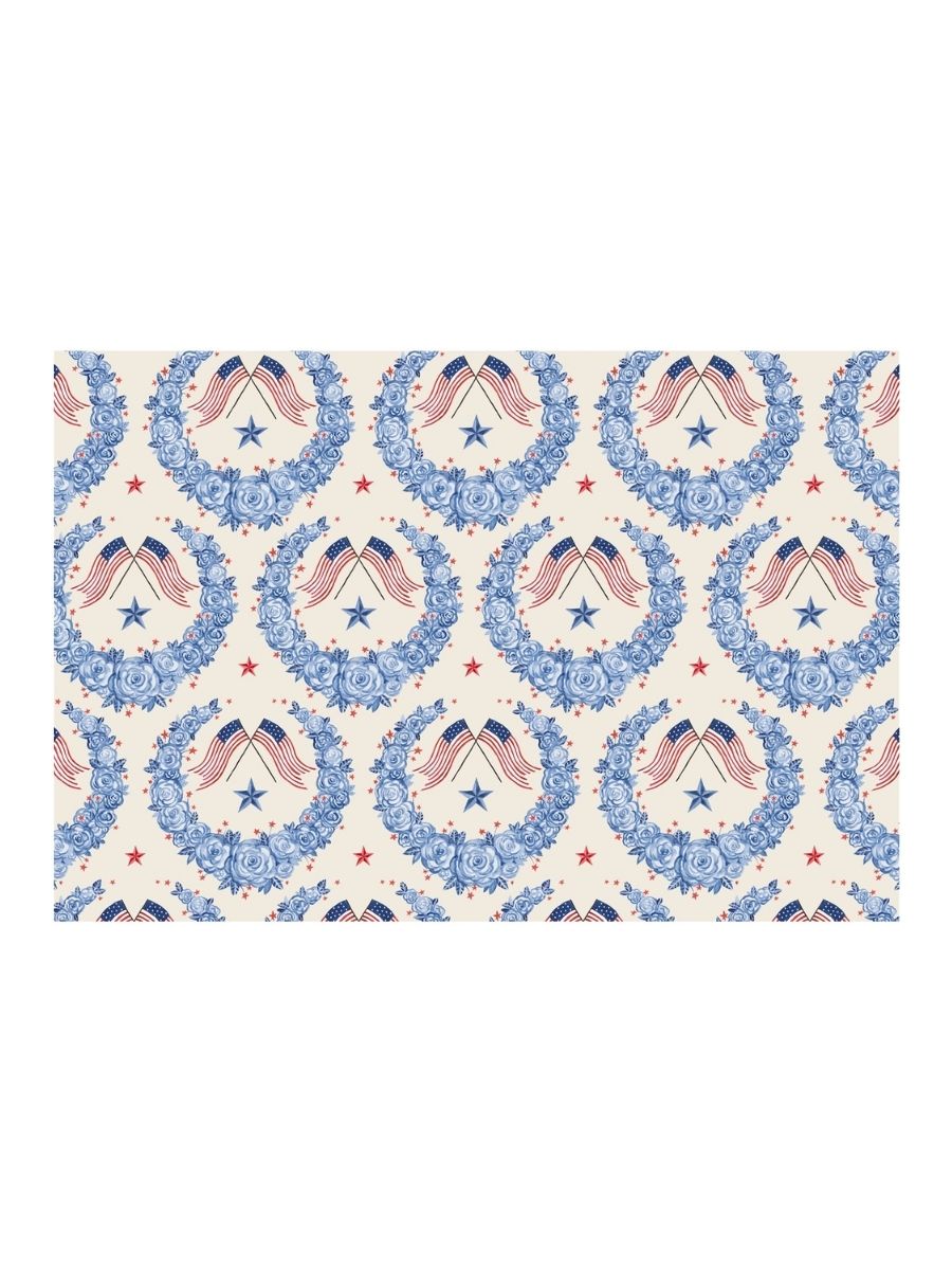 Elegant and thoughtfully detailed, American Floral Placemats bring a refined Americana touch to the table. Soft blue floral wreaths are paired with delicate red stars and crossed flags, creating a balanced design that feels both classic and celebratory. The pattern offers a subtle nod to heritage and unity while maintaining a light, decorative feel.