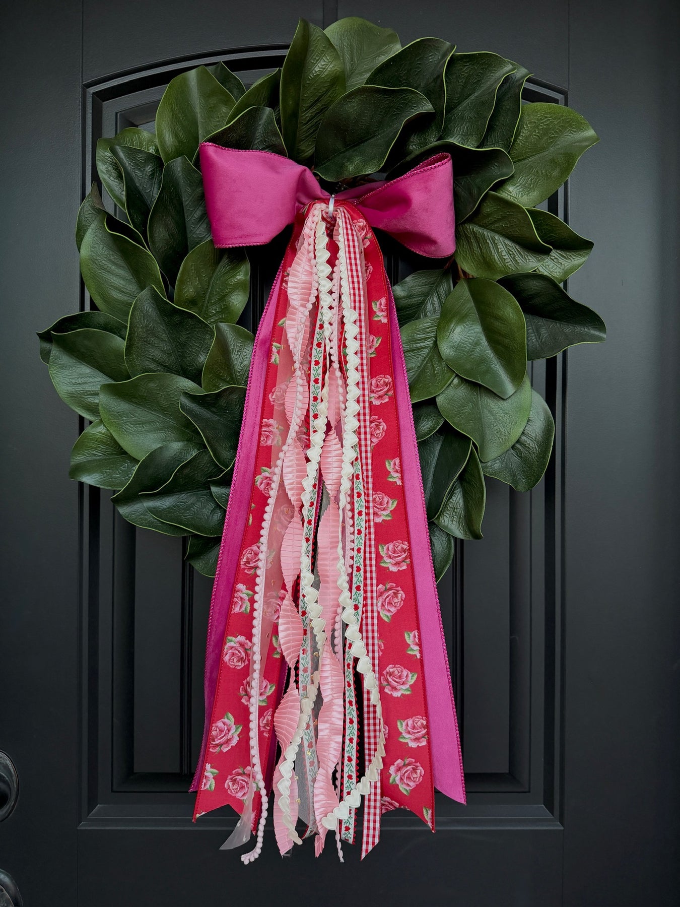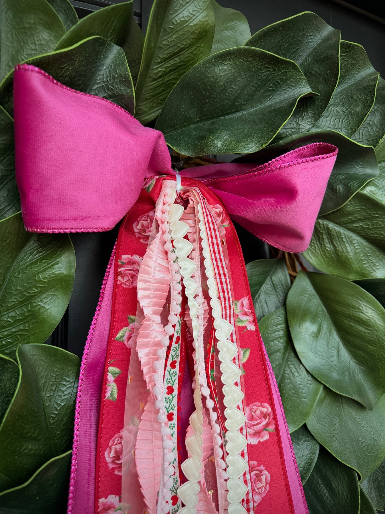 Romantic, timeless, and softly nostalgic, Rosette Reverie is a Valentine’s Designer Bow inspired by heirloom florals and love notes from years past. Featuring a curated mix of rose-printed ribbons, delicate trims, and rich shades of pink and crimson, this bow creates a statement that feels both collected and intentional.