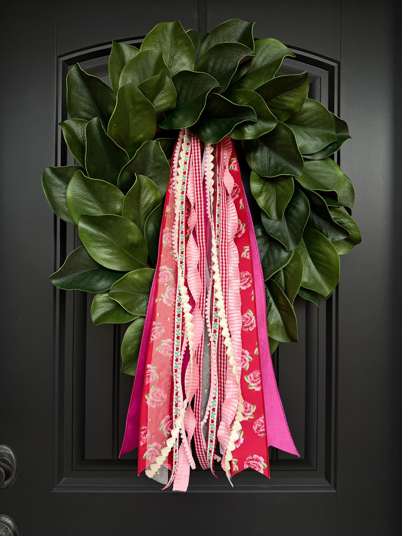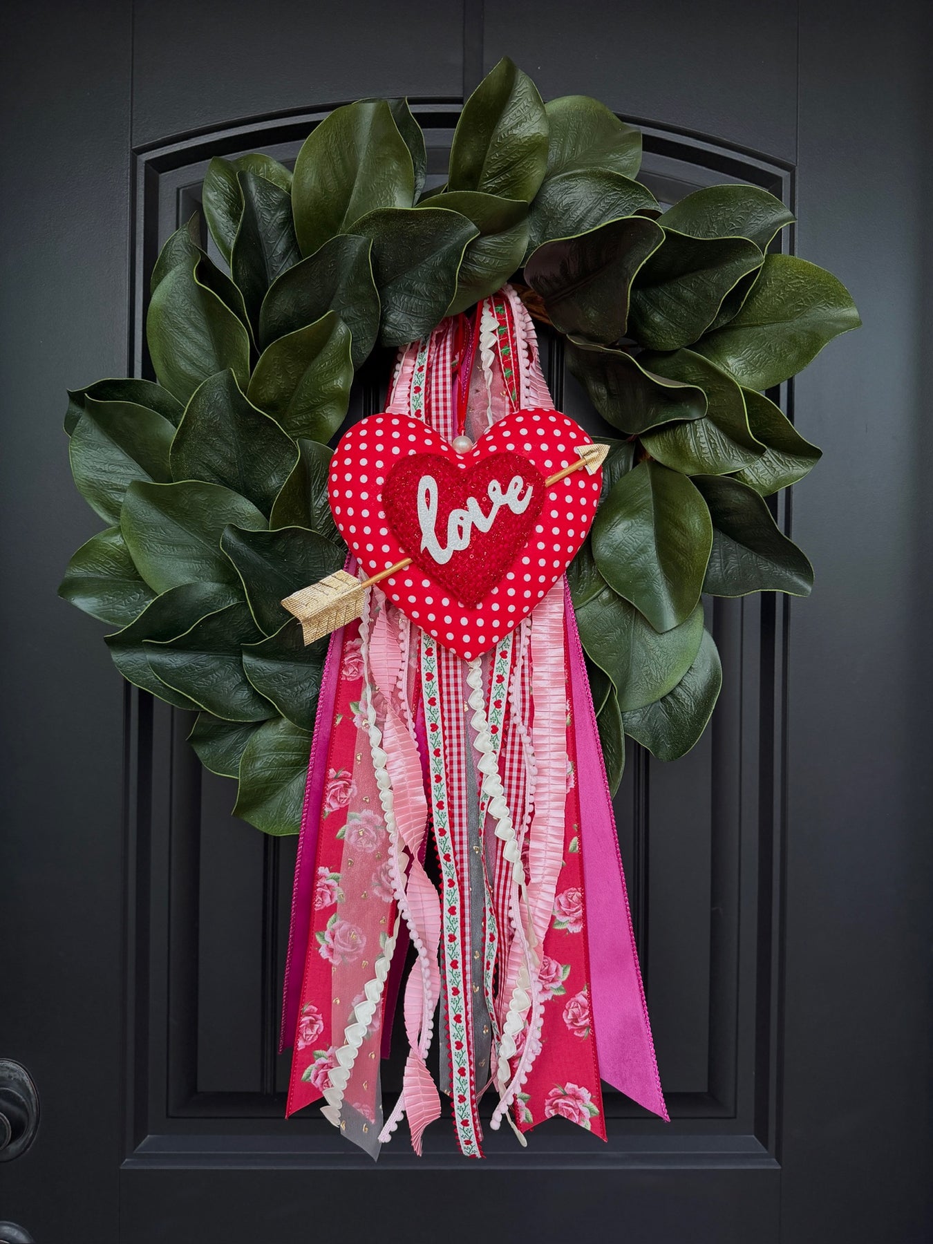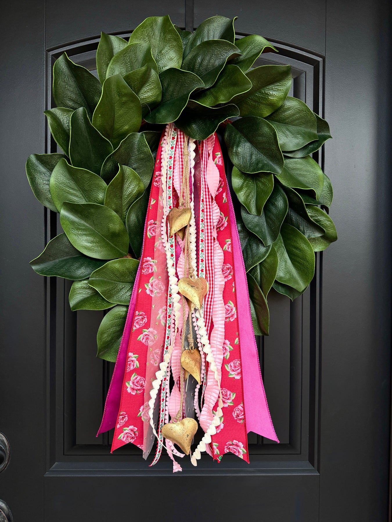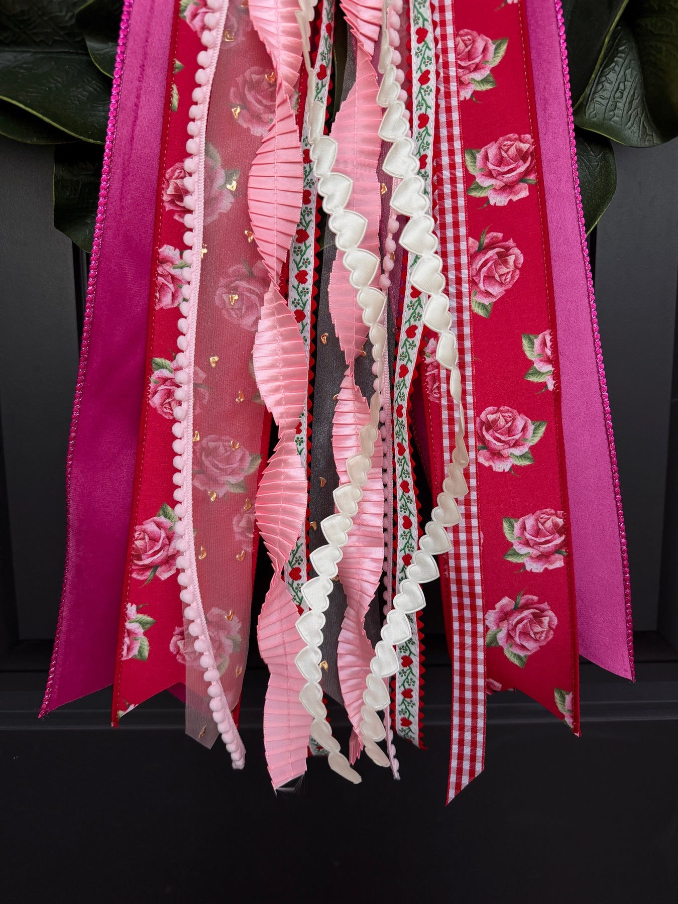 Romantic, timeless, and softly nostalgic, Rosette Reverie is a Valentine’s Long ribbon set inspired by heirloom florals and love notes from years past. Designed with cascading layers of rose-printed ribbons, delicate trims, and rich shades of pink and crimson, this piece creates an elegant, flowing statement on doors, wreaths, and seasonal displays.
