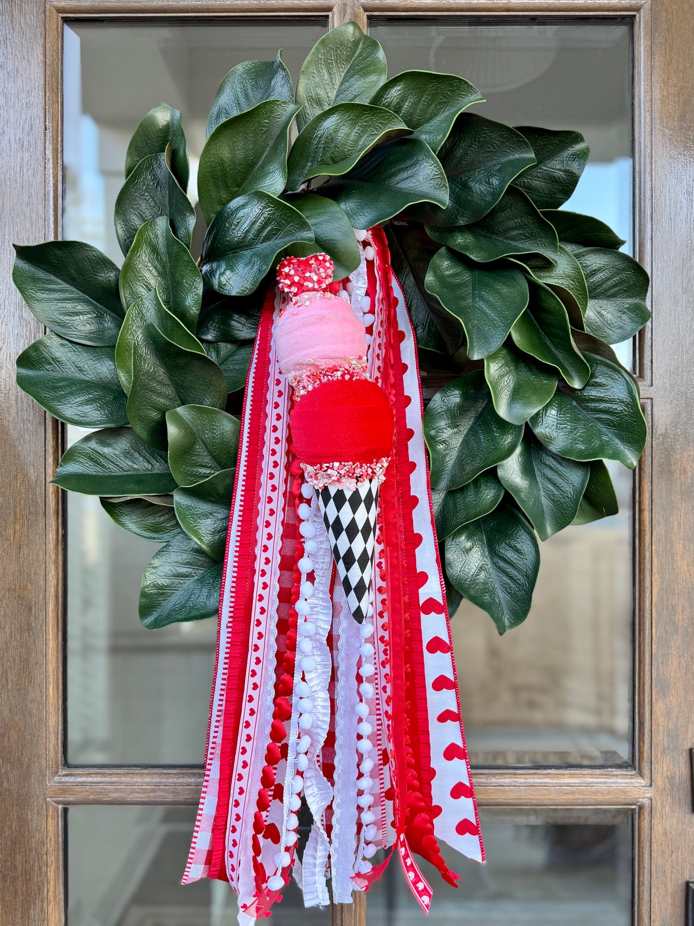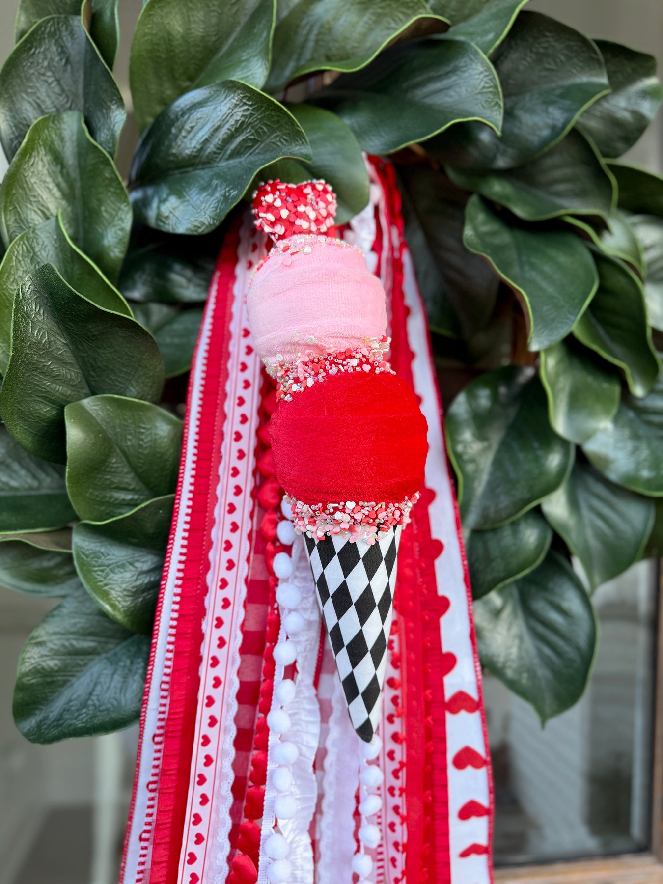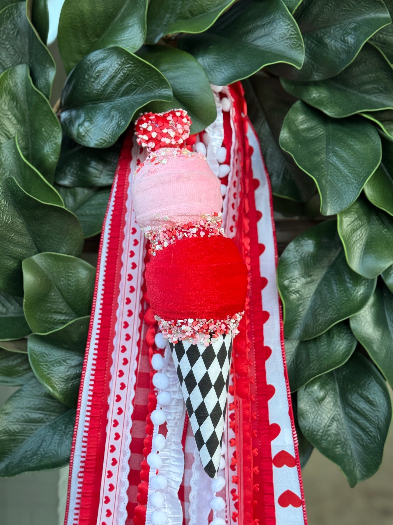 A little whimsical and completely irresistible, our Cupid’s Double Scoop is the sweetest Valentine accent for your seasonal styling. With pink and red fabric-wrapped “scoops,” heart-shaped sprinkles, shimmering bead details, and a bold harlequin cone, it’s a darling finishing touch and a perfect addition to your Valentine ribbons for extra charm and texture.