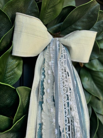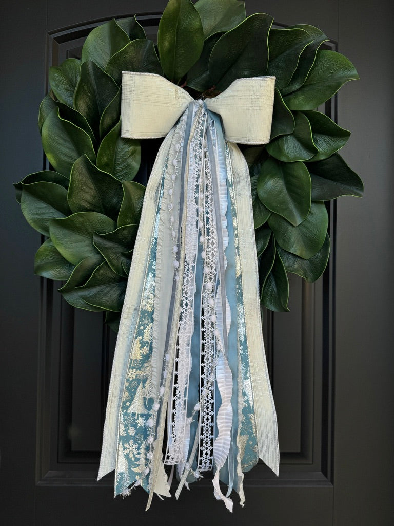 Snowy serenity meets vintage elegance. The Winter Blues Designer Bow layers cool-toned silvers and icy blues with glistening white lace and embroidered evergreens for a look that feels both frosty and refined. Inspired by snow-dusted forests and the hush of winter mornings, this combination brings a peaceful seasonal touch to wreaths, mantels, or entryways.