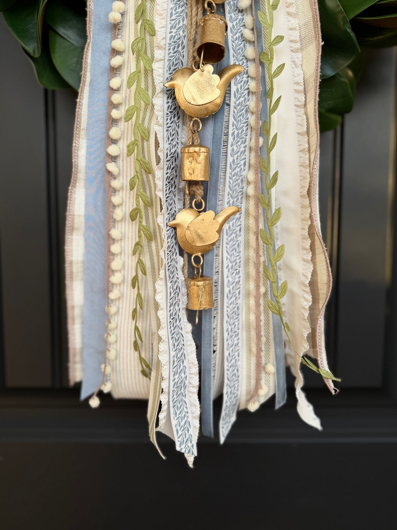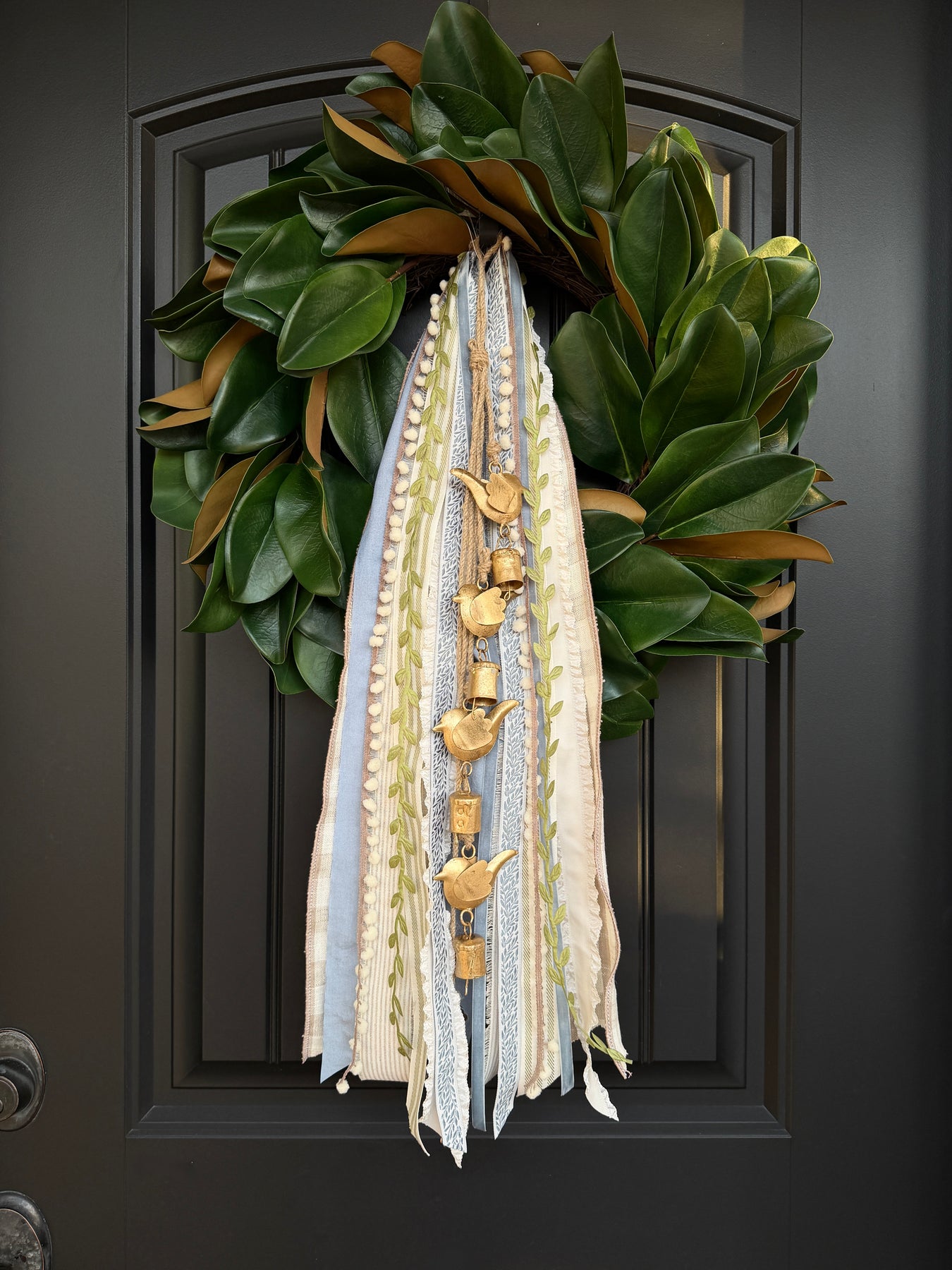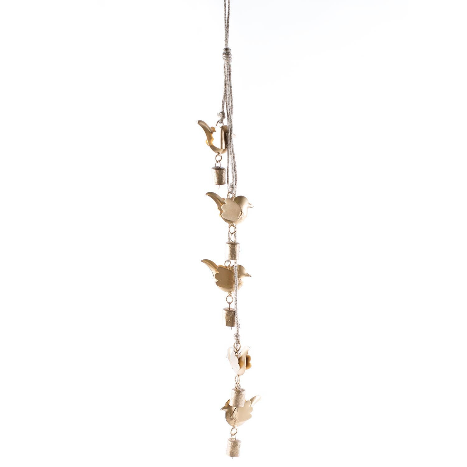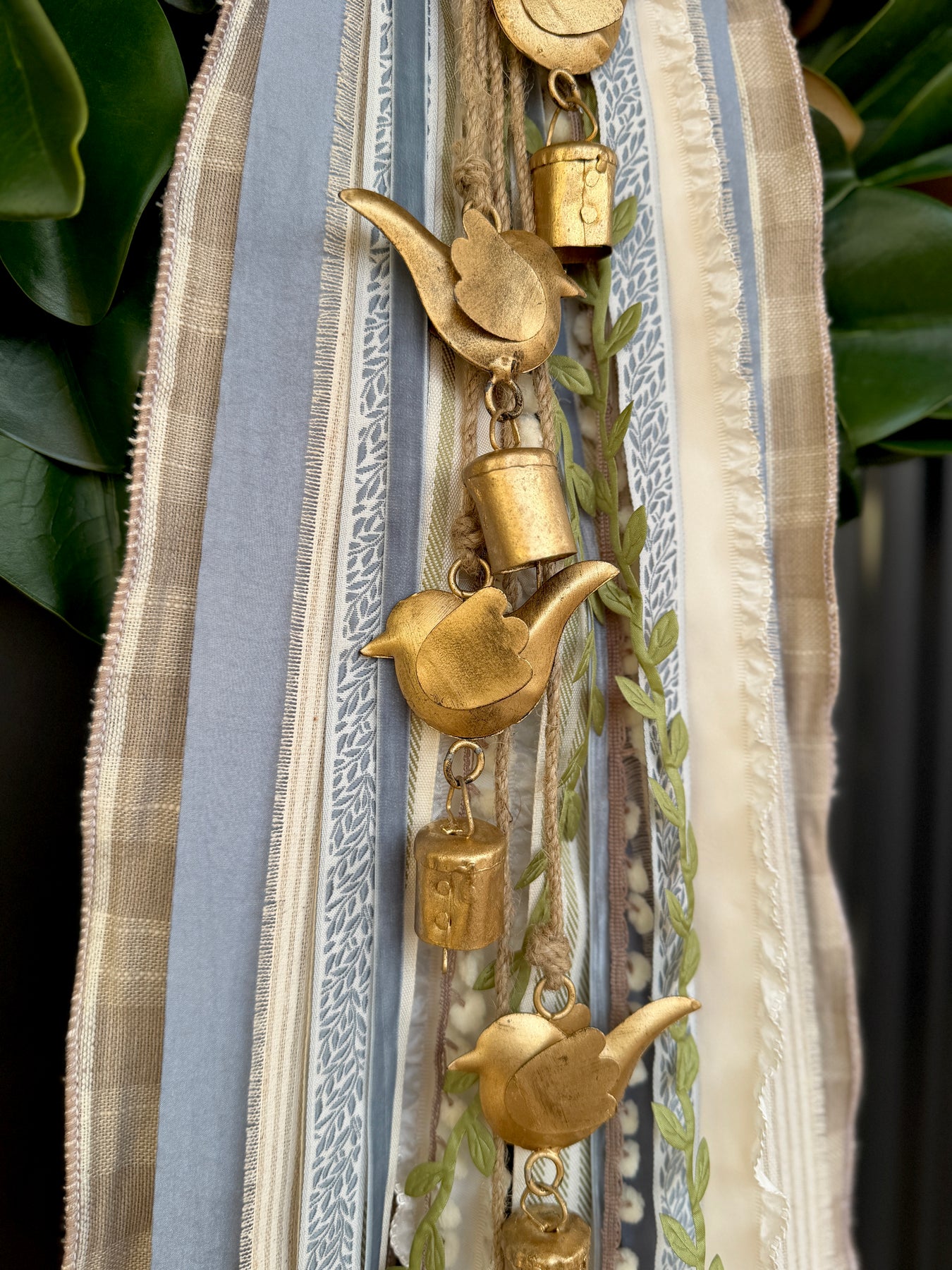 Softly charming and full of golden warmth, our Bird Bells add a sweet, collected touch to your seasonal styling. Featuring a vertical strand of metal birds with petite hanging bells and a brass finish, it’s perfect for layering on doors, hooks, mantels, or tucked into wreath décor for a gentle jingle and extra detail.