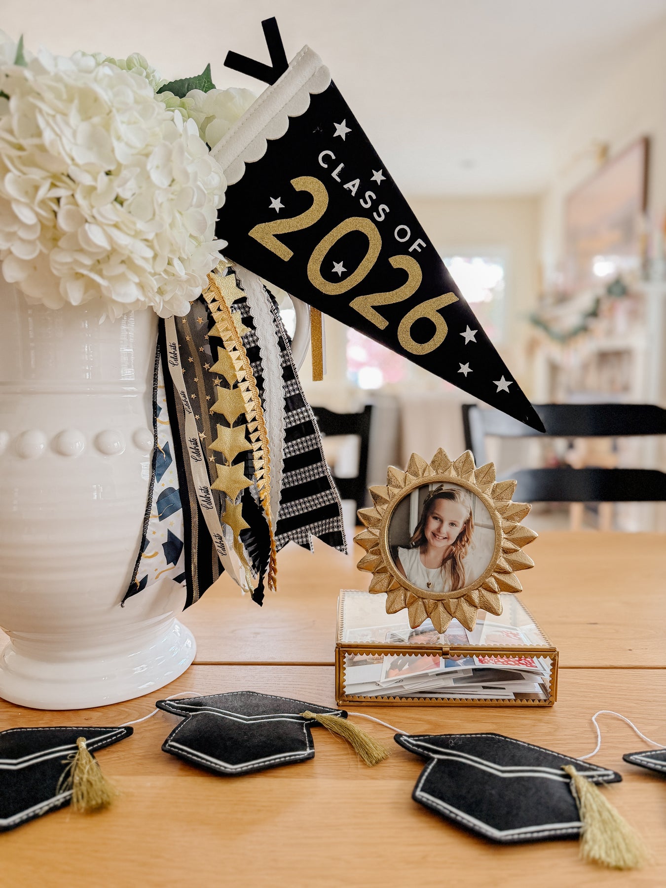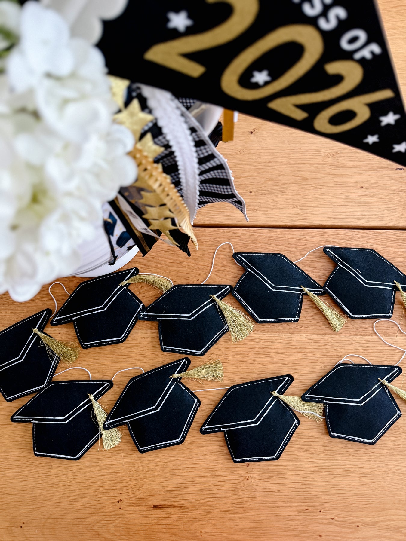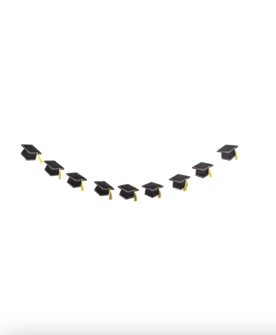 Caps Off Garland is the sweetest finishing touch for graduation parties, photo backdrops, and celebratory tablescapes. Featuring puffy felt grad caps with golden tassels, this classic black-and-gold garland adds a polished pop of school spirit to mantels, dessert tables, porches, and party entrances.