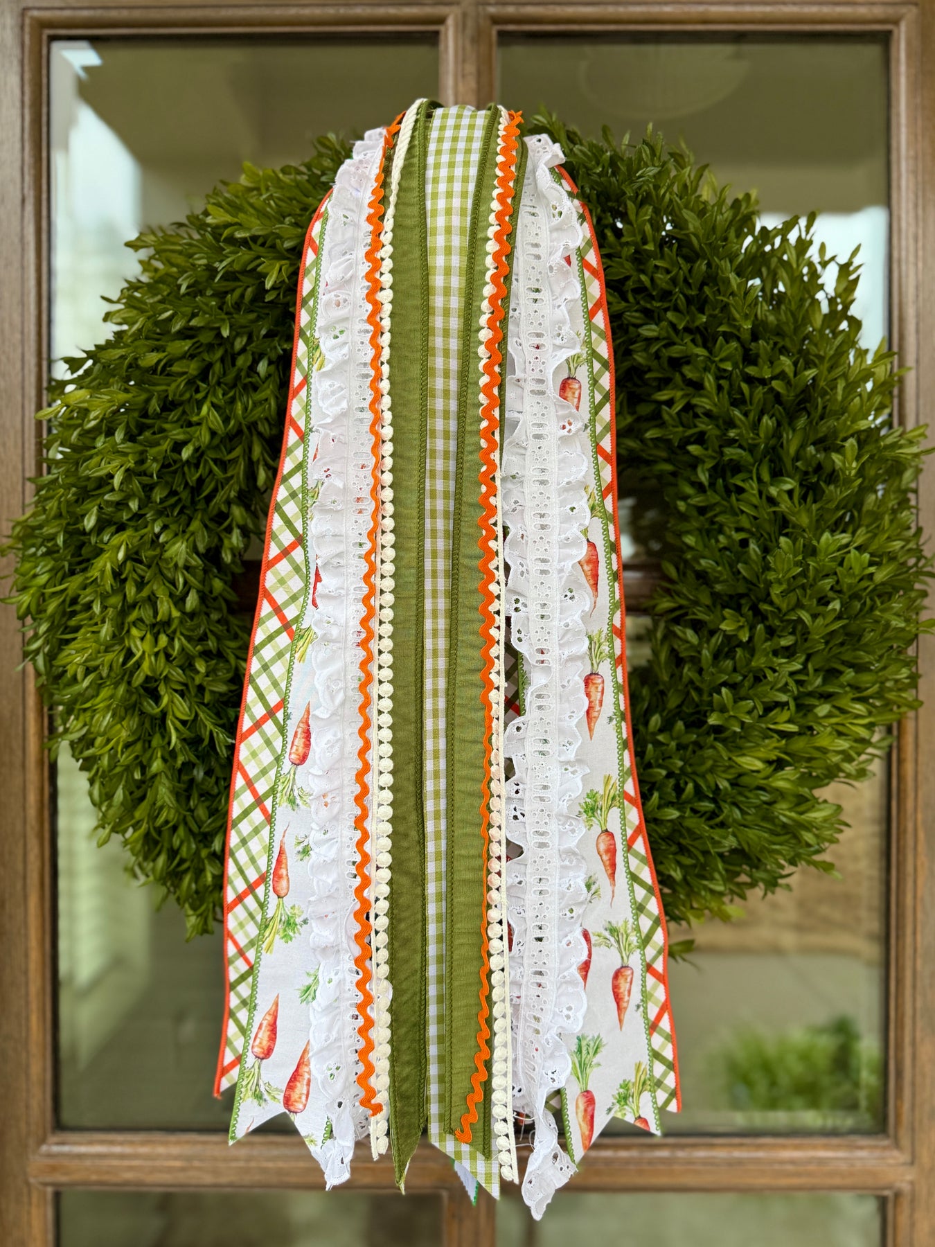 Made to cascade beautifully on your front door wreath, Cottage Garden (Long) adds an extra pop of spring with flowing ribbon tails and playful pattern. From the sweet carrot details to the fresh green gingham and textured trims, it’s an easy way to brighten your entry for Easter and the whole spring season.
