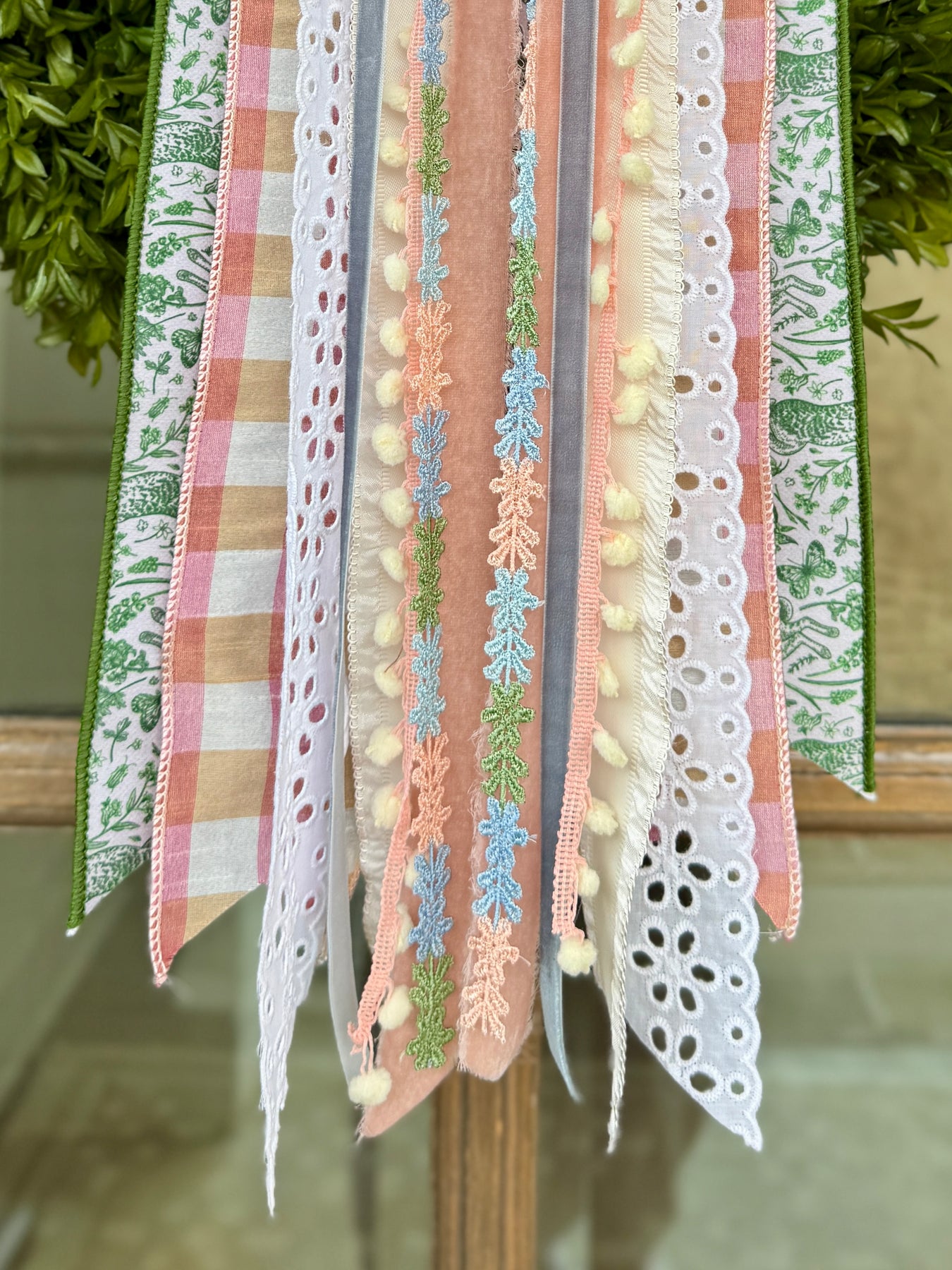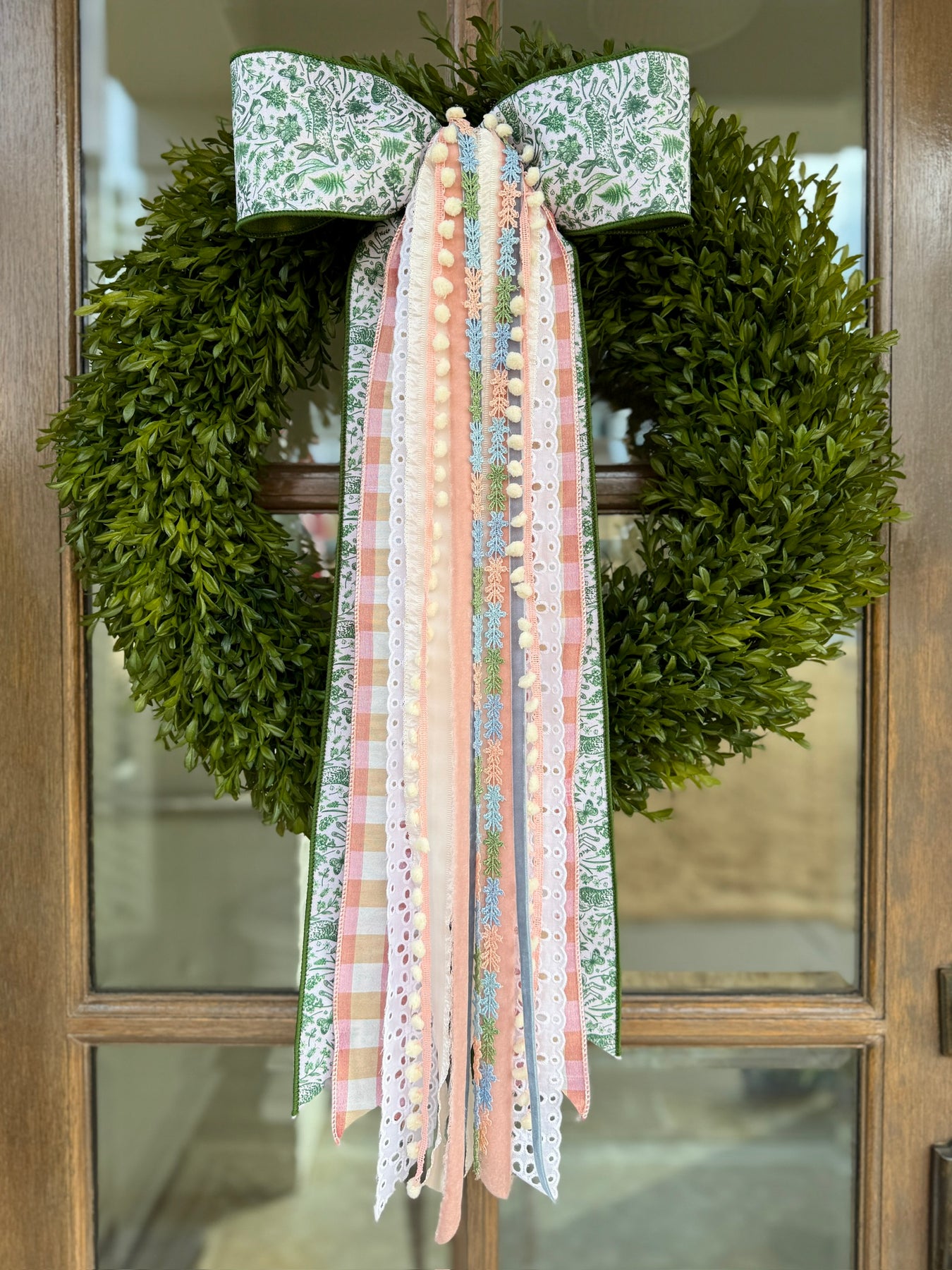 Fresh, cheerful, and full of spring color, our Garden Society Designer Bow is a beautiful statement for your front door wreath. Layered with crisp greens, soft blush gingham, gentle blues, and sweet floral details, it’s finished with playful trims for texture and movement that feels light and perfectly seasonal.