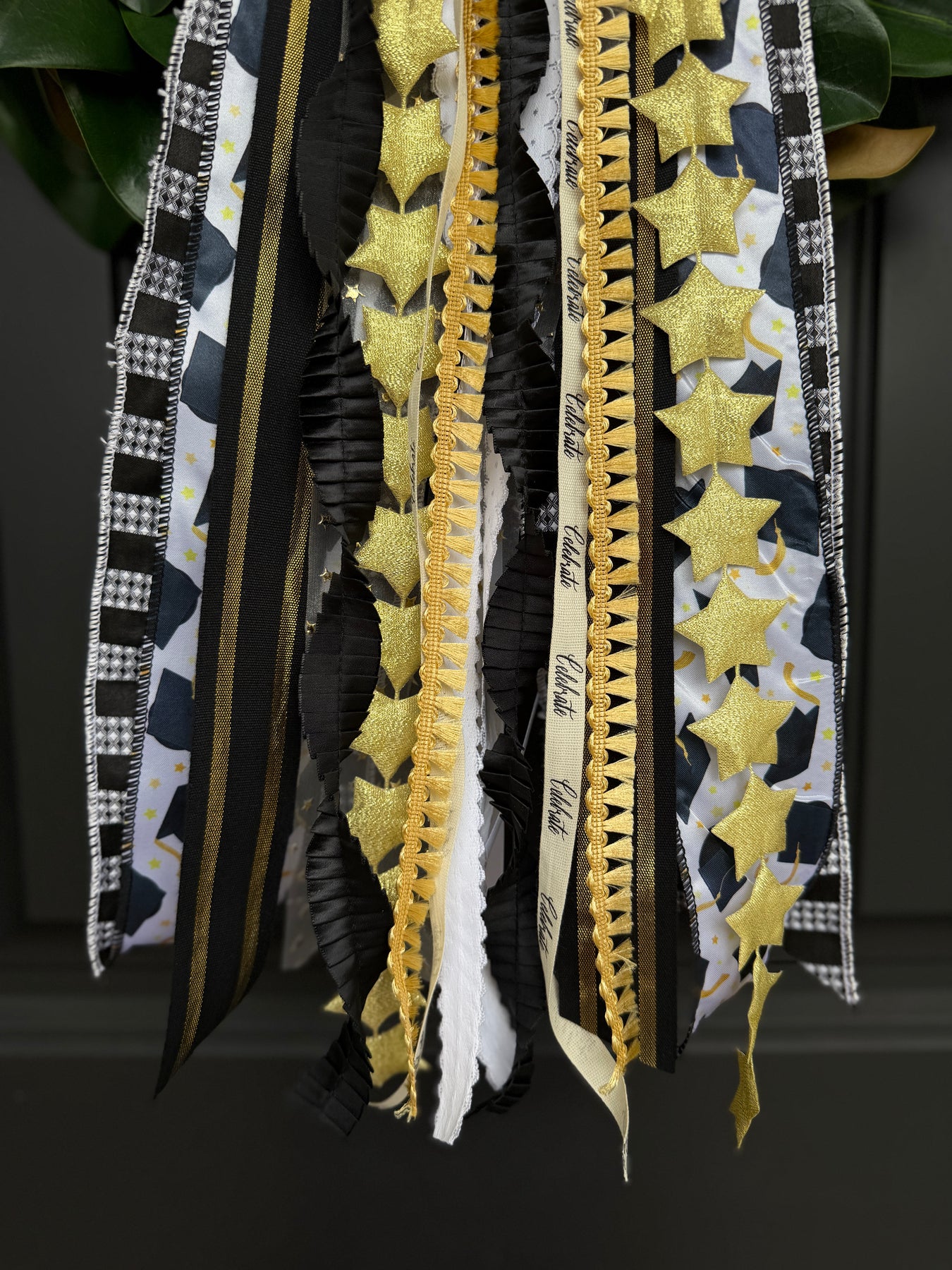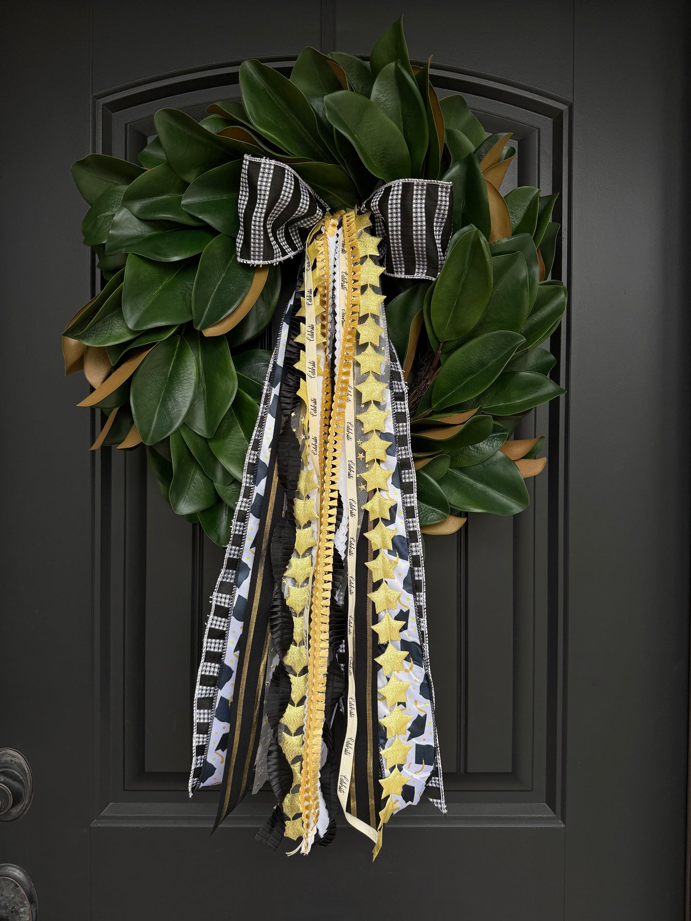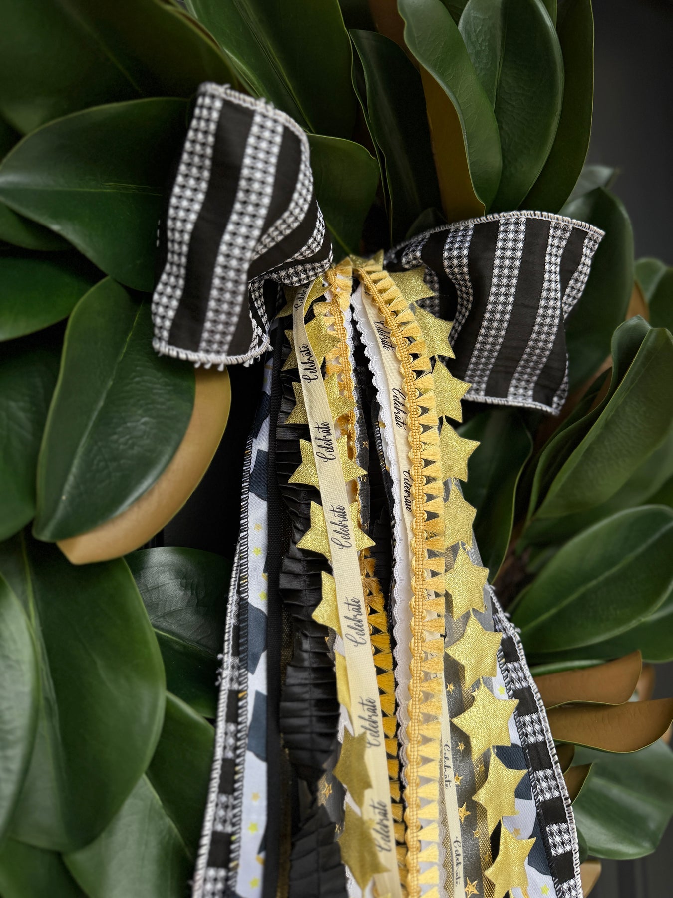 Honor every achievement with our Graduation Designer Bow. Designed in a sophisticated palette of black, gold, and ivory, this elegant set brings a celebratory touch to your front door or party decor. A timeless way to mark the milestone and make your graduate feel truly special!