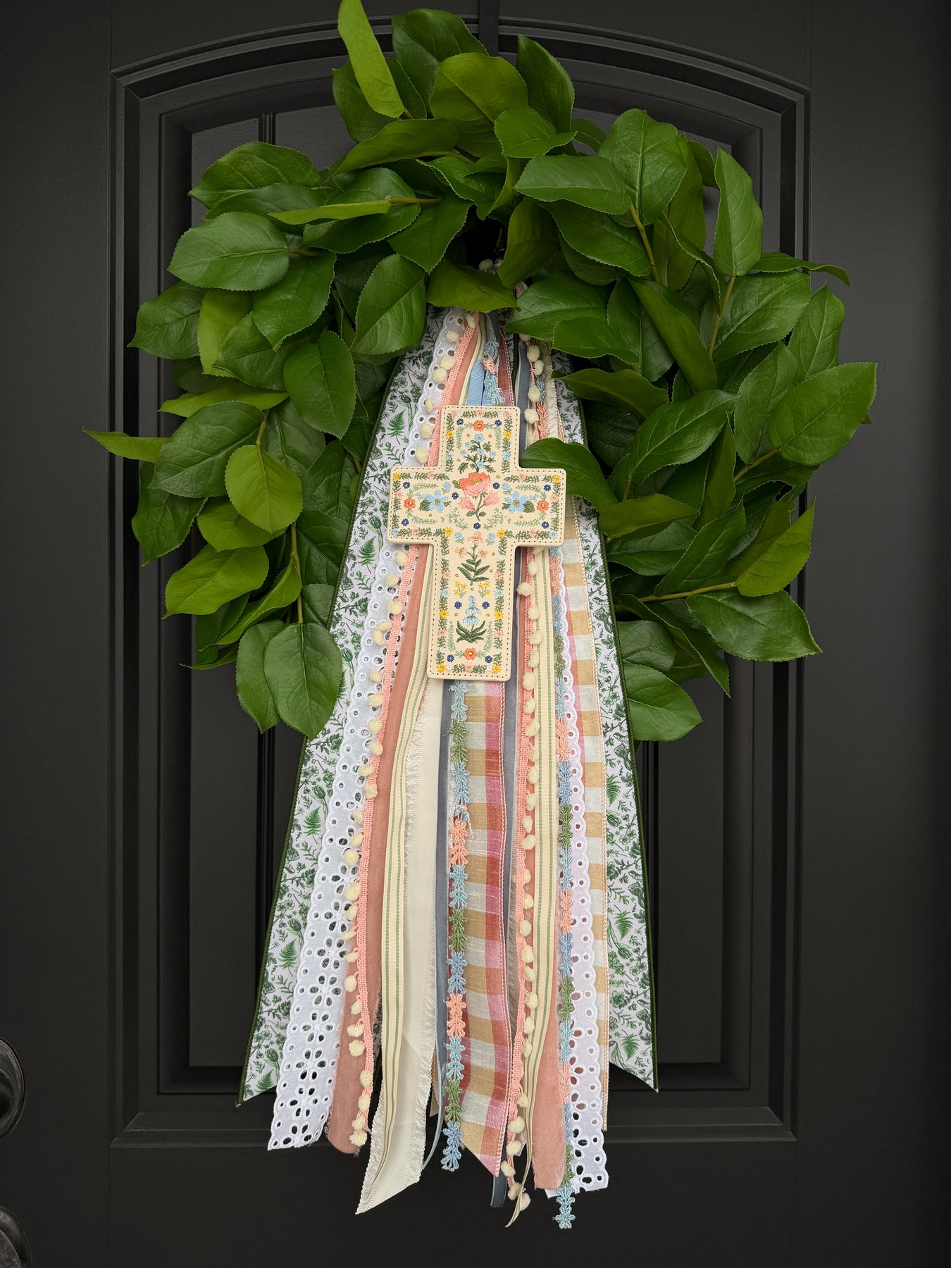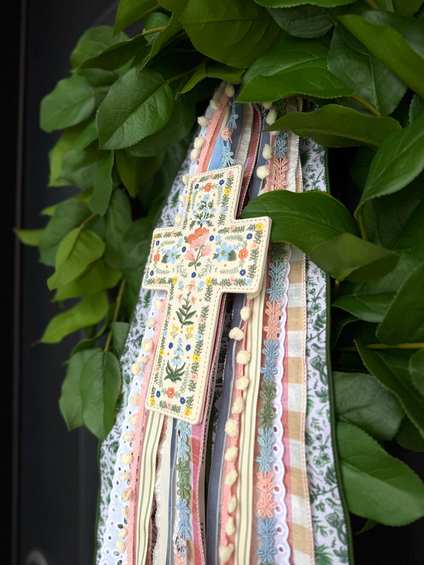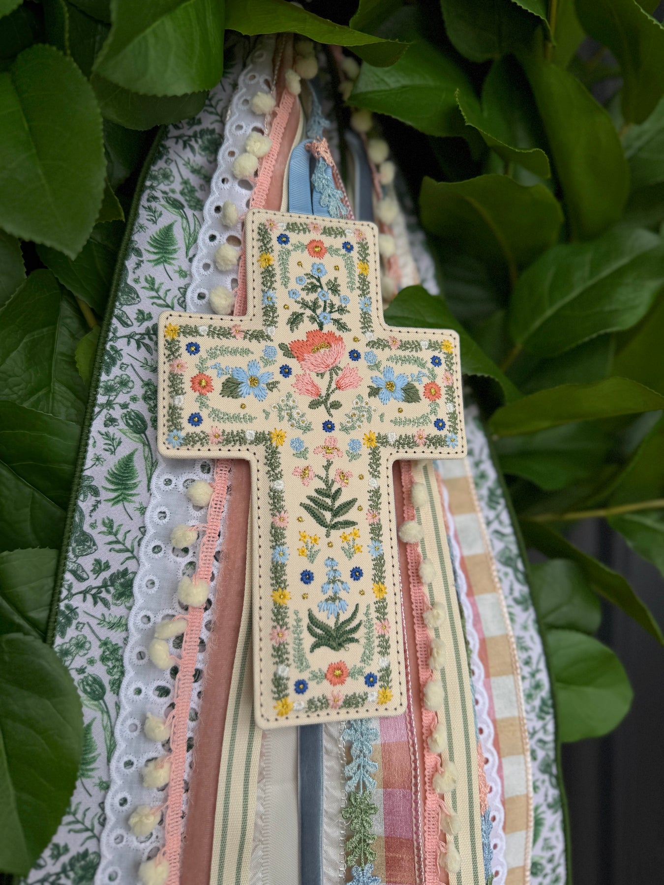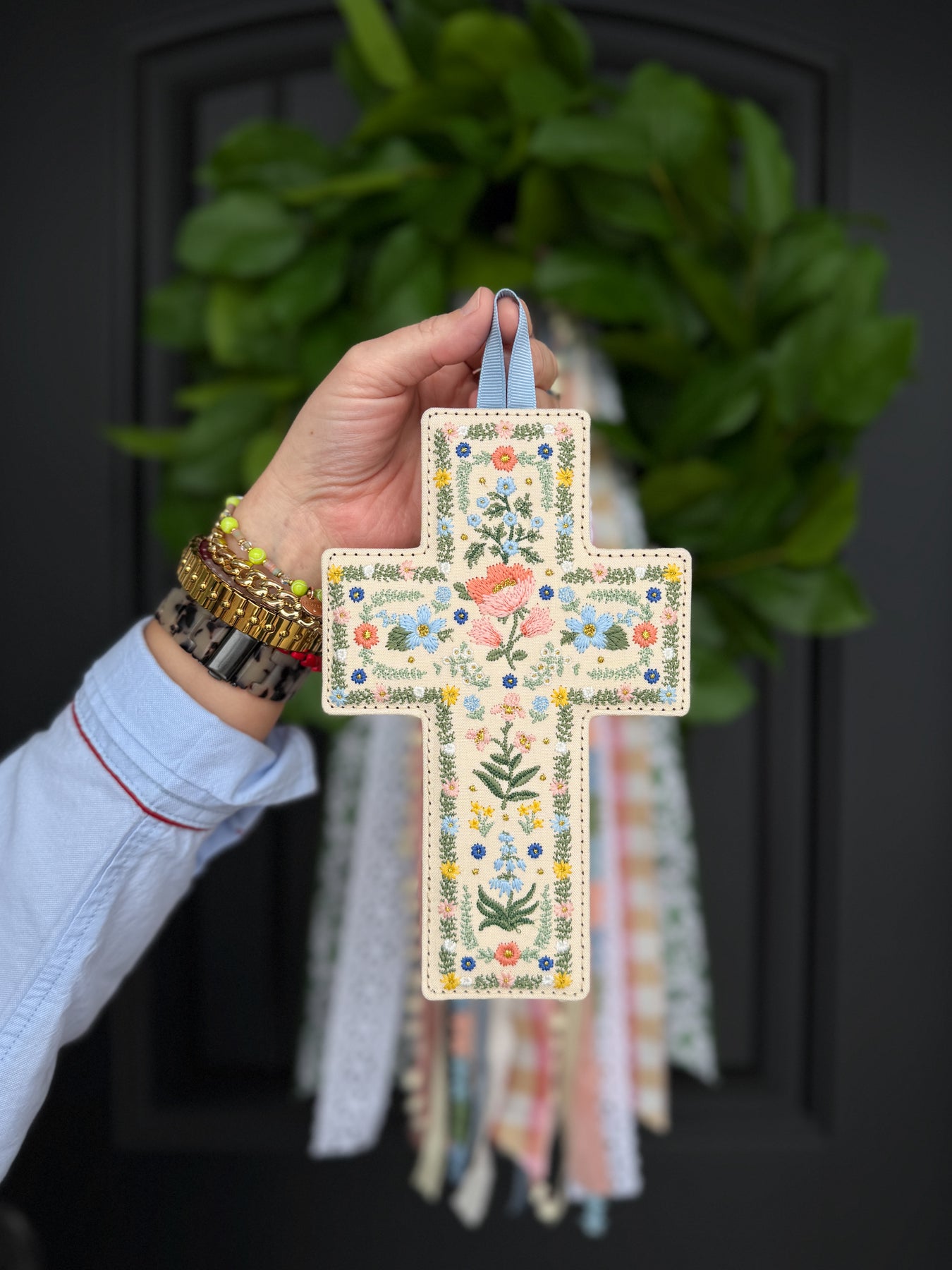 Rosette Garden Cross is a beautiful embroidered accent for spring and Easter, featuring delicate florals in soft, cheerful colors and a sweet blue hanging loop. It pairs beautifully with your Easter and Spring ribbons on a wreath—layer it right into your ribbons for an extra-special, meaningful finishing touch.