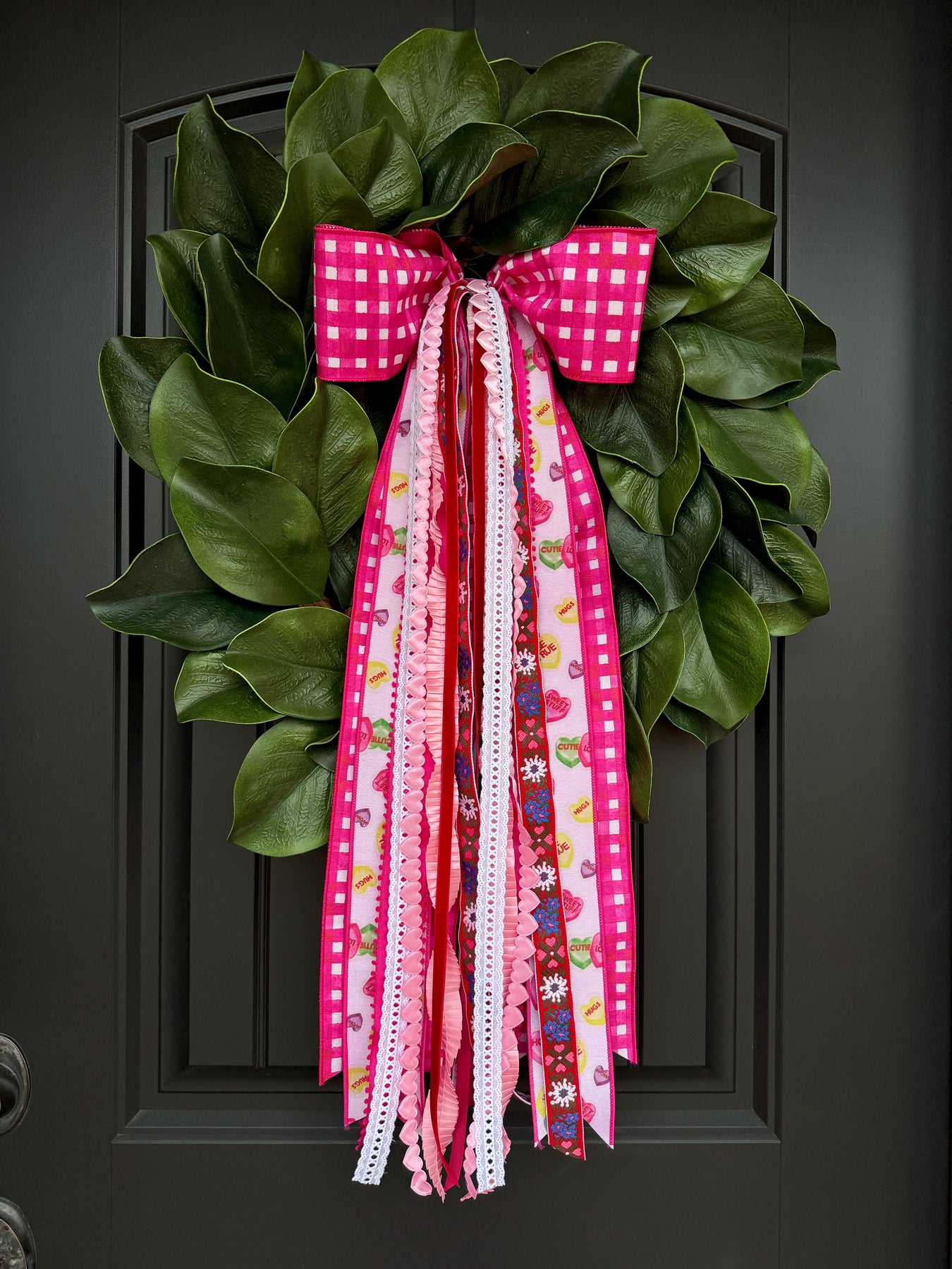 Playful with a classic twist, Sweet on You is a Valentine bow that brings charm and color to your seasonal décor. Layered with cheerful pinks, timeless gingham, whimsical heart prints, and soft textured trims, this bow feels nostalgic yet fresh.