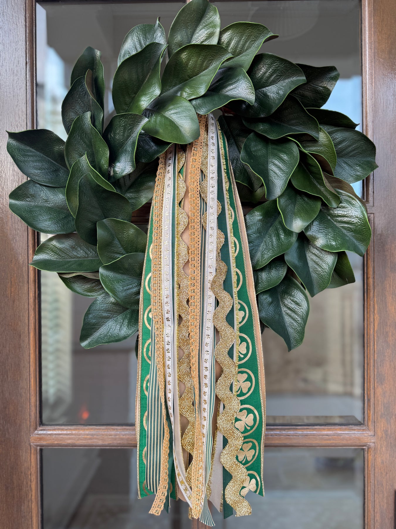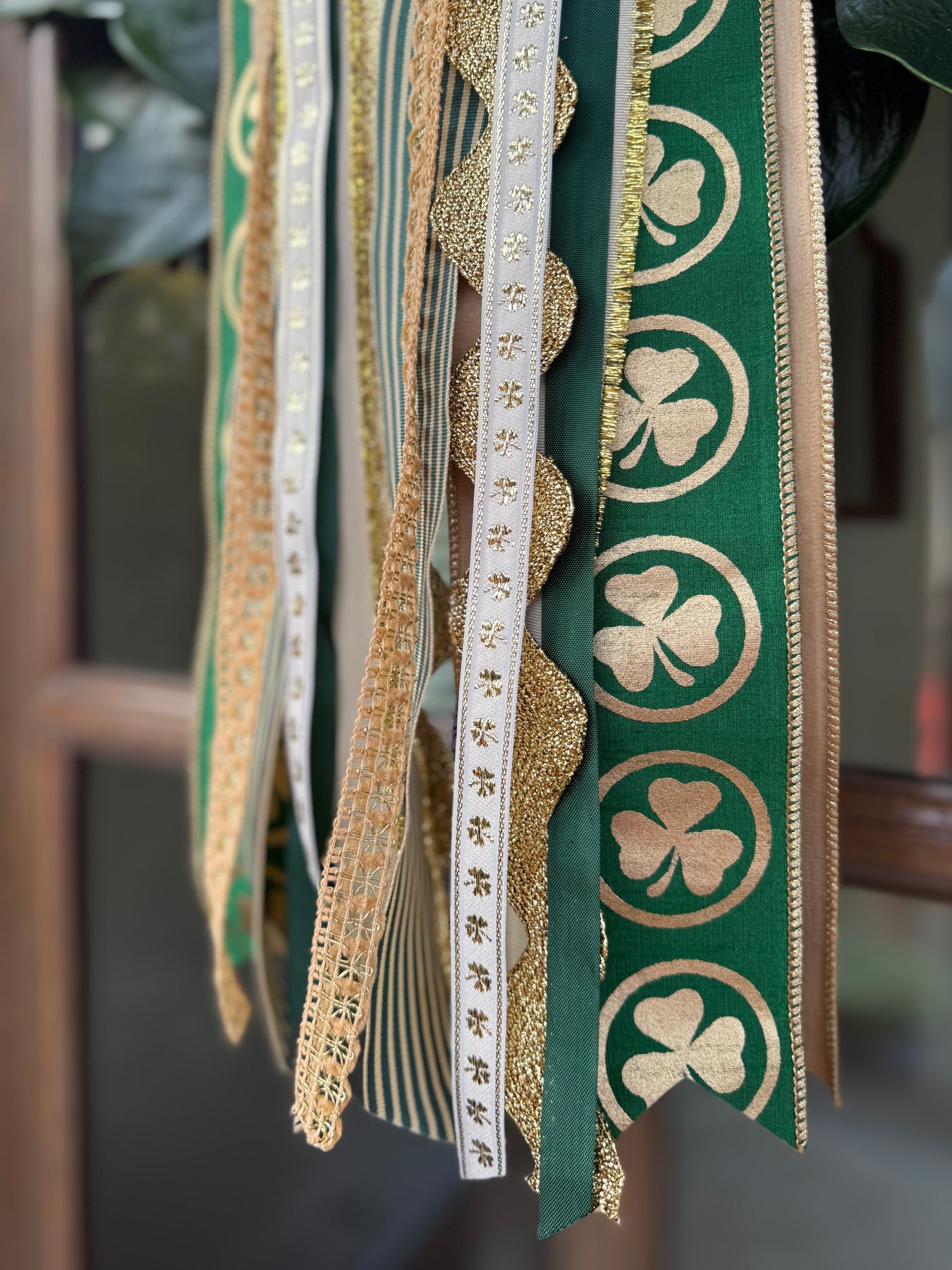 Made to cascade beautifully on a front door wreath, Turnberry Lucky Charm - Long creates a dramatic, layered finish with luxe movement and elevated detail. From the soft velvet base to standout shamrock prints and glimmering gold accents, this flowing style is perfect when you want your entryway décor to feel festive, refined, and boutique.
