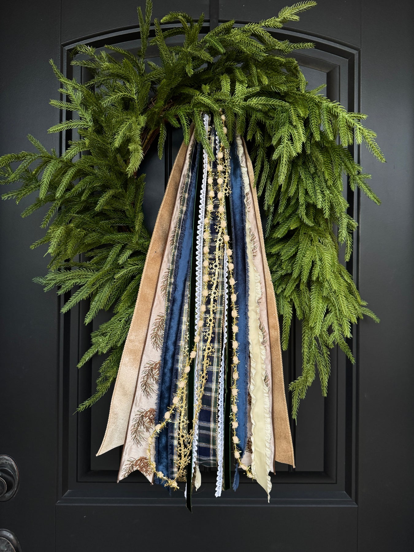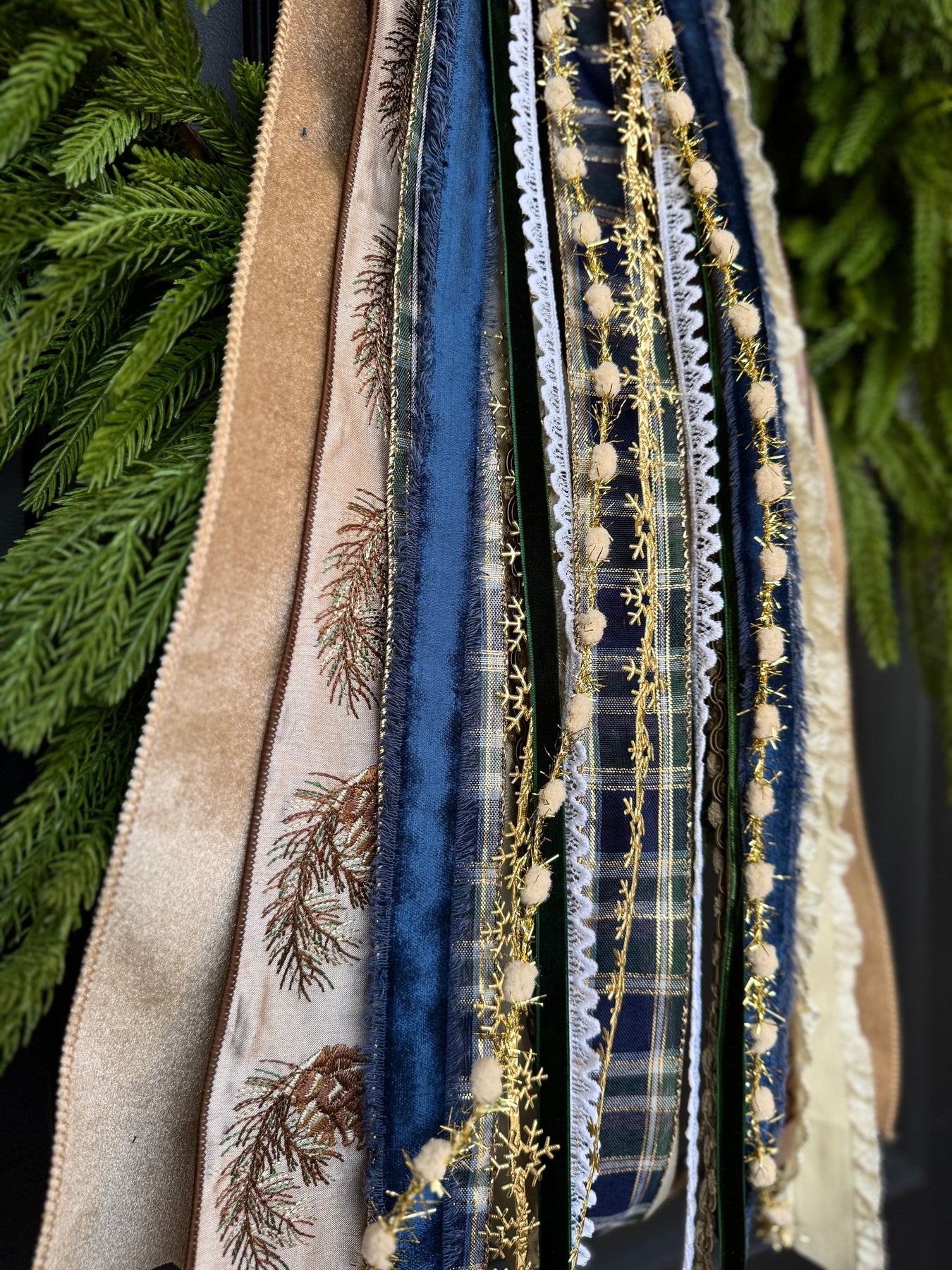 A textural cascade of seasonal charm. The Yuletide Manor - Long features a stunning blend of luxe velvet, embroidered pine boughs, crisp tartan, delicate lace, and sparkling gold thread. Whether styled on a wreath, mantel, or hook, this curated ribbon bundle brings warmth, movement, and story to your winter decor.